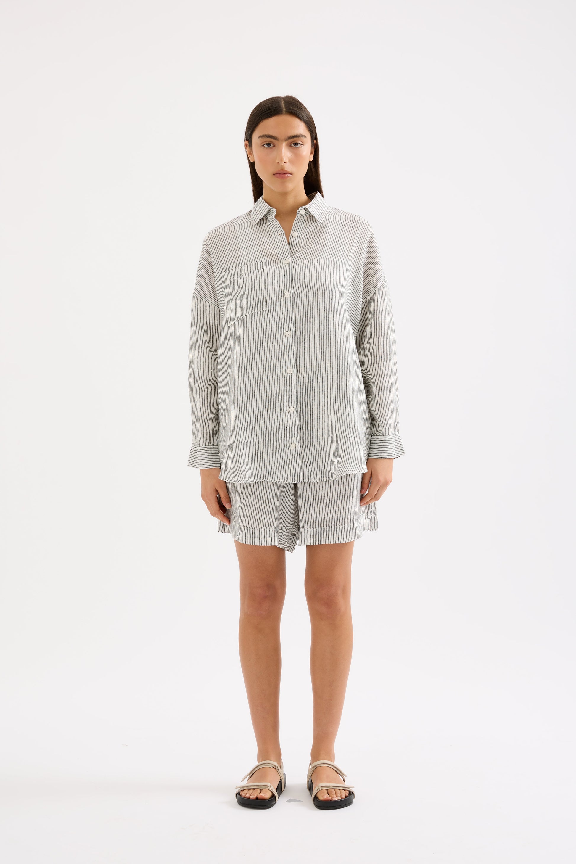 The Lounge Stripe Heritage Short is made in a premium 100% organic French linen which has been washed down for a soft and breathable hand feel. The silhouette is a classic boxer short silhouette finishing mid-thigh. Features include an elasticated waistband with a Nude. Heritage patch label on the centre front, and patch pockets on the back.