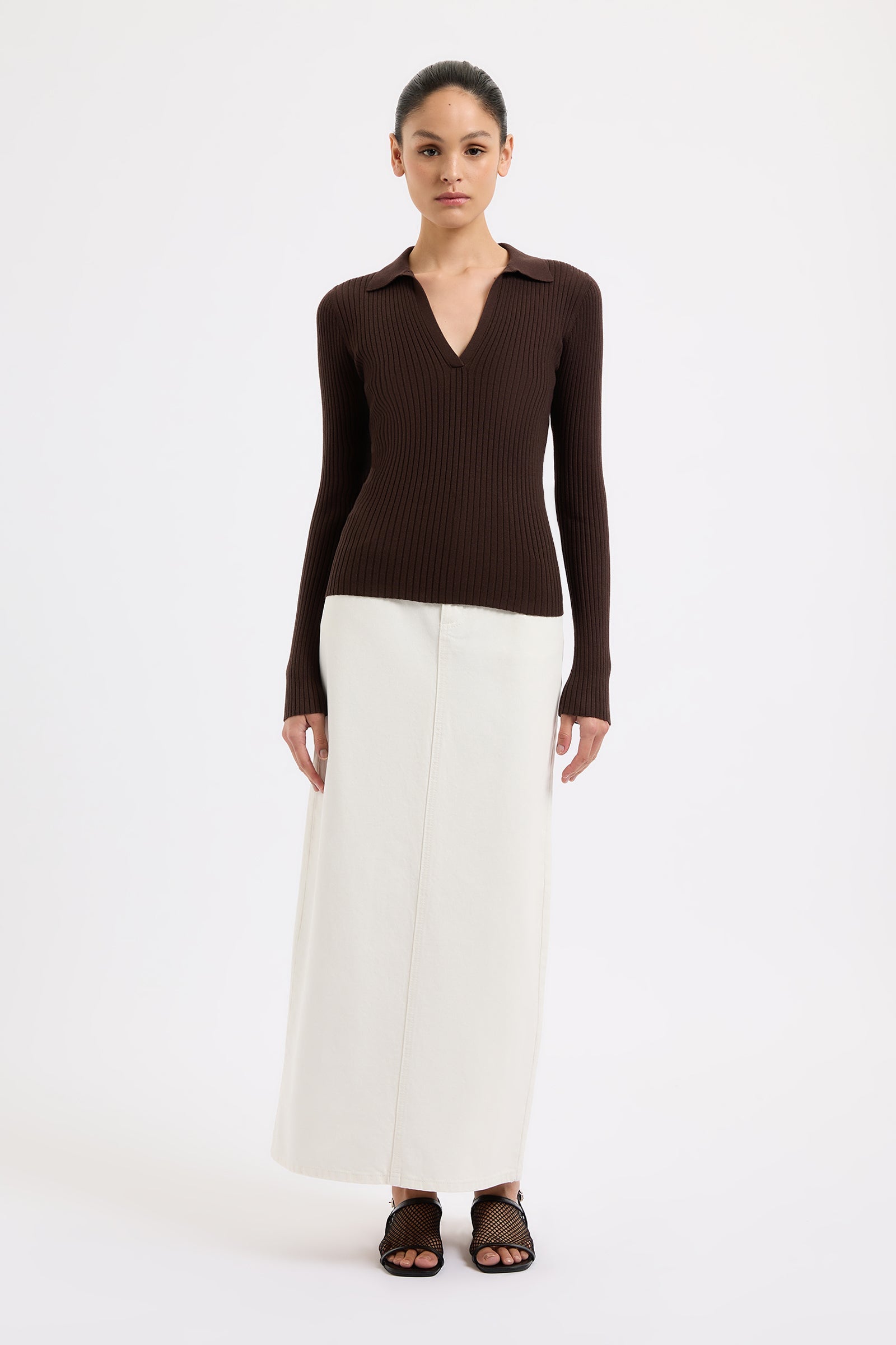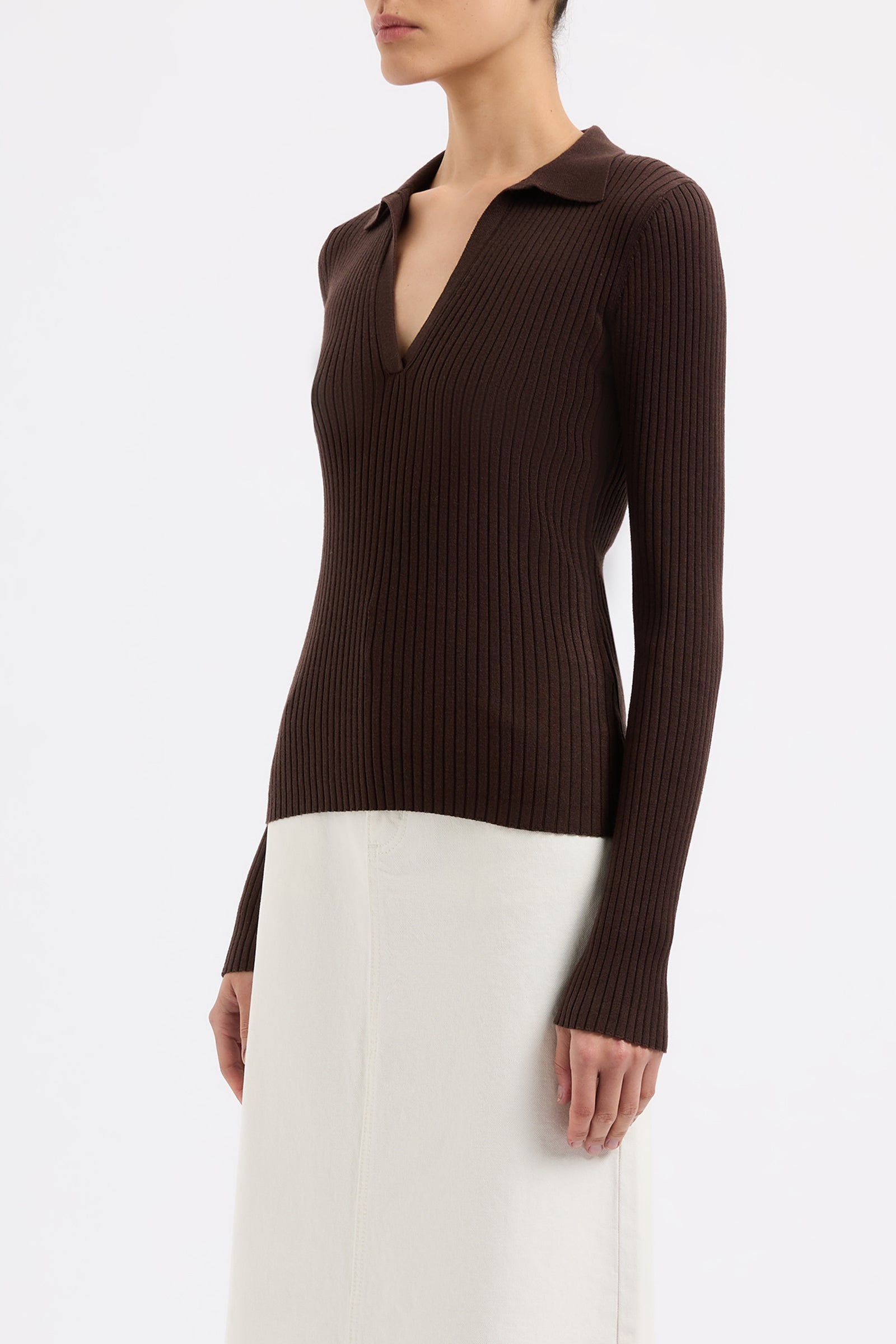 The Lourdes Rugby Knit is made from a lightweight cotton blend yarn which is soft on the skin. The silhouette is slim fitting with full length sleeves and length sitting at hip level. Features include a fully knitted rugby collar and a classic rib pattern construction through the body.