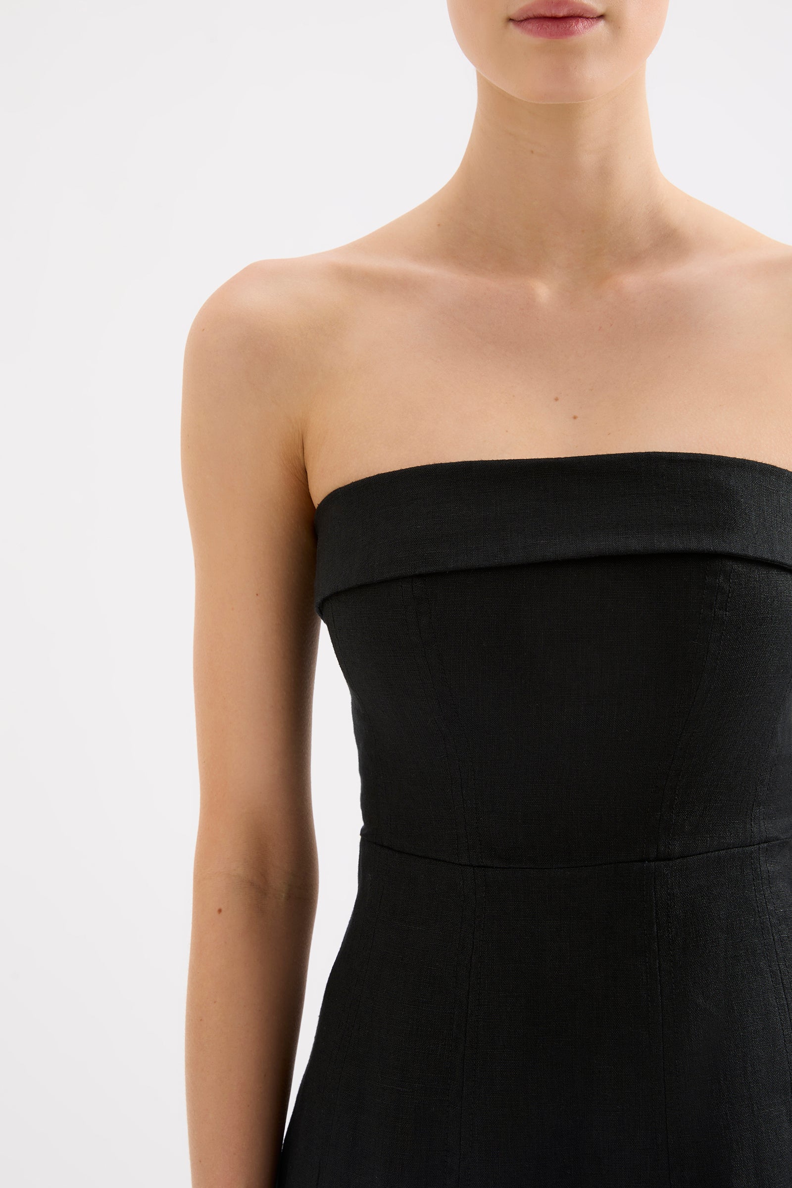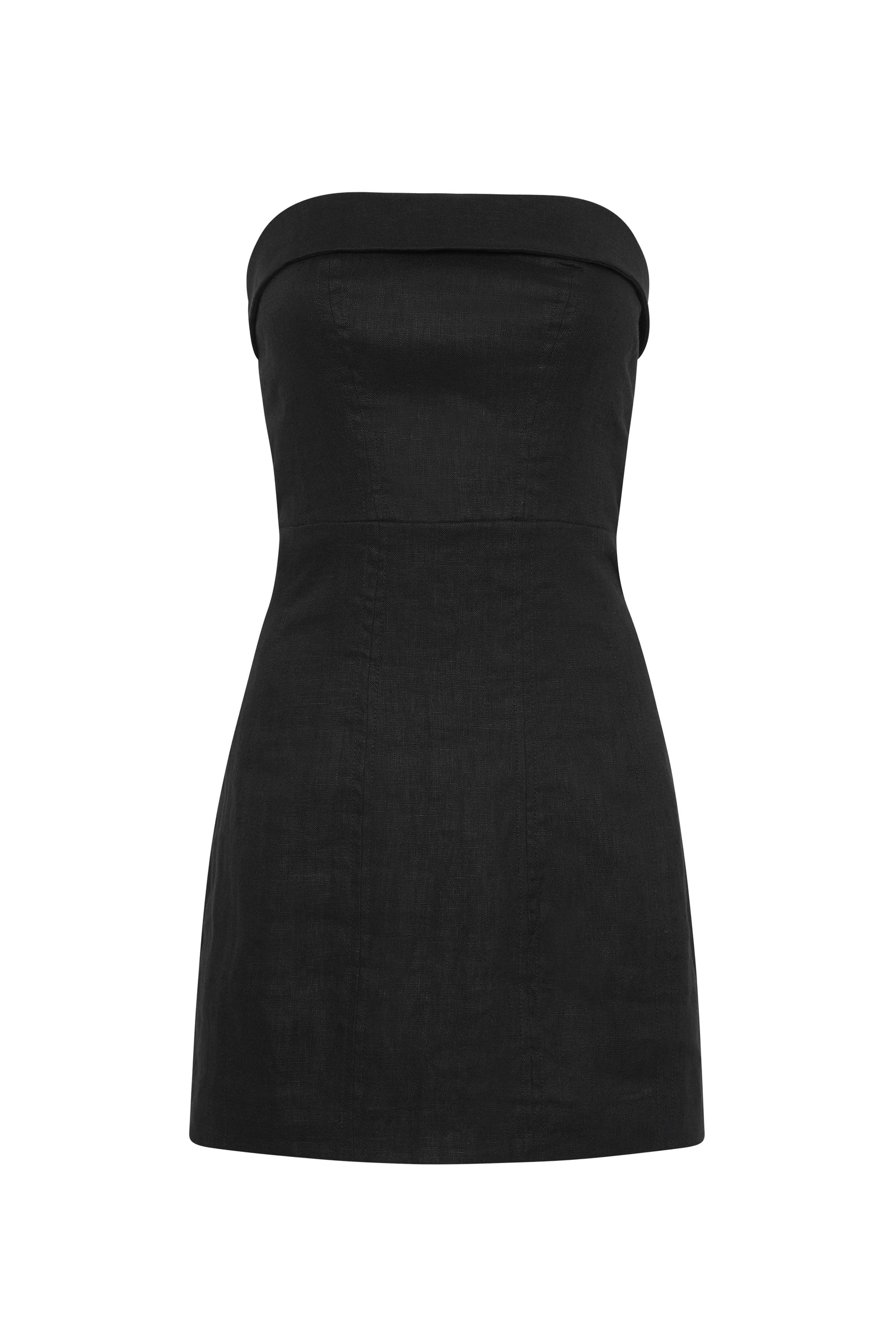 The Lyra Linen Dress in black is made from 100% linen which has been washed for a soft, breathable hand feel. The strapless silhouette is fitted at the bodice with an a line skirt that is mini in length. Features include panels to create shaping and zipper at centre back. This dress is fully lined.