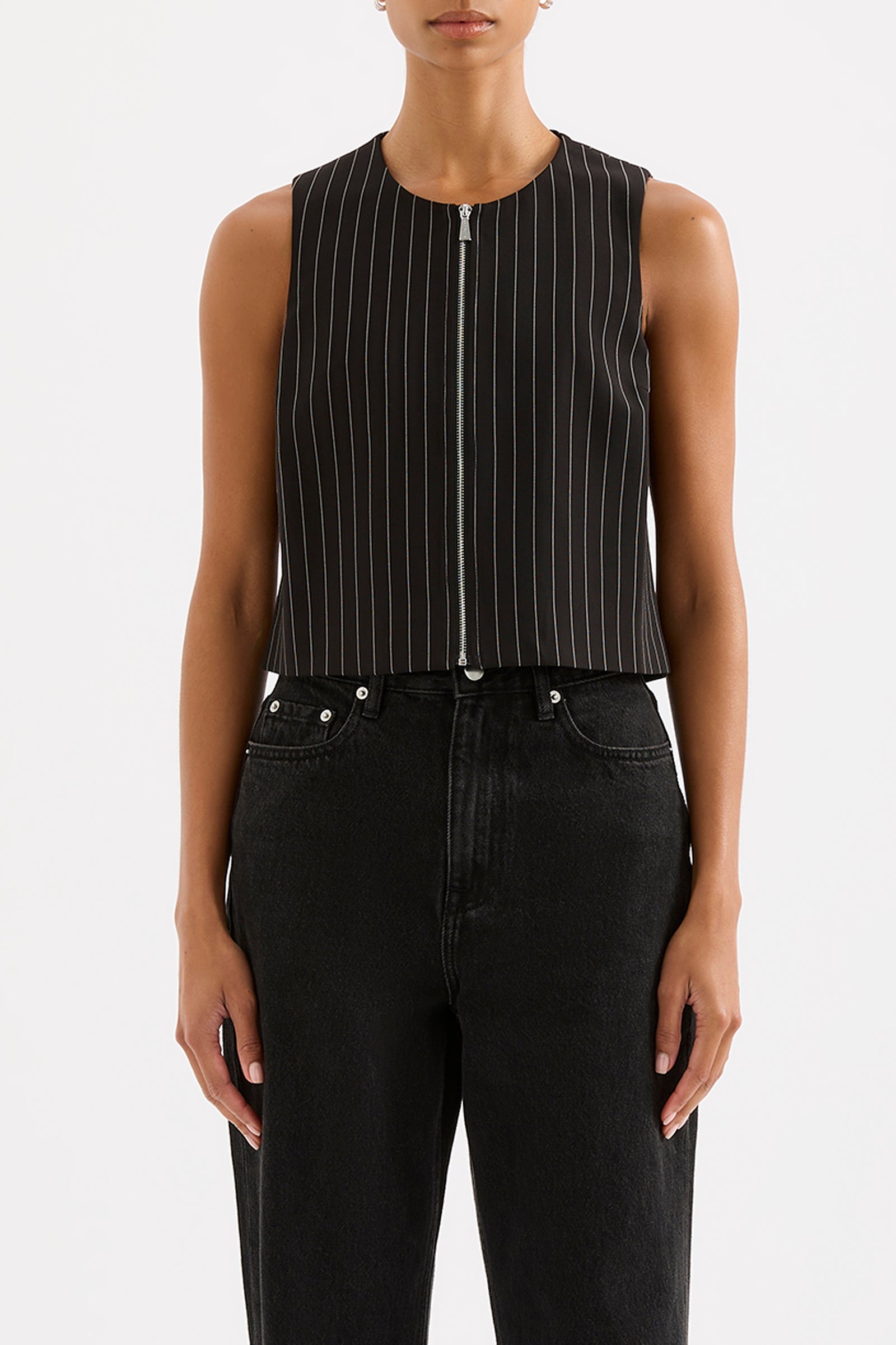 The Maeve Pinstripe Vest is made from a midweight tailoring fabric which has a smooth handfeel. The silhouette is comfortable and cropped, finishing at the waist. Features include a crew neckline and a centre front zipper opening with branded zipper puller.