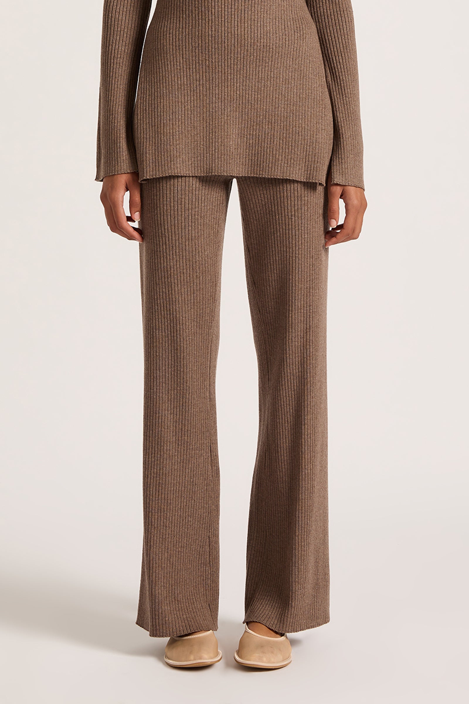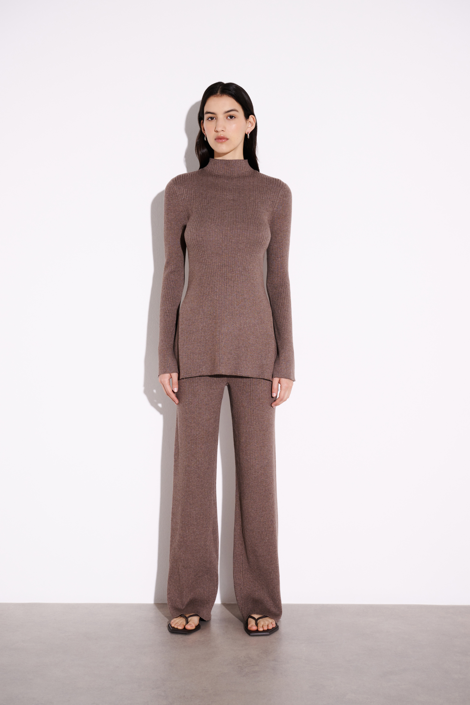 The Malo Knit Pant is made from a cotton blend yarn that is breathable and has a ribbed finish. The silhouette is a high rise, full length pant with a flared leg opening. Features include an elasticated waistband.