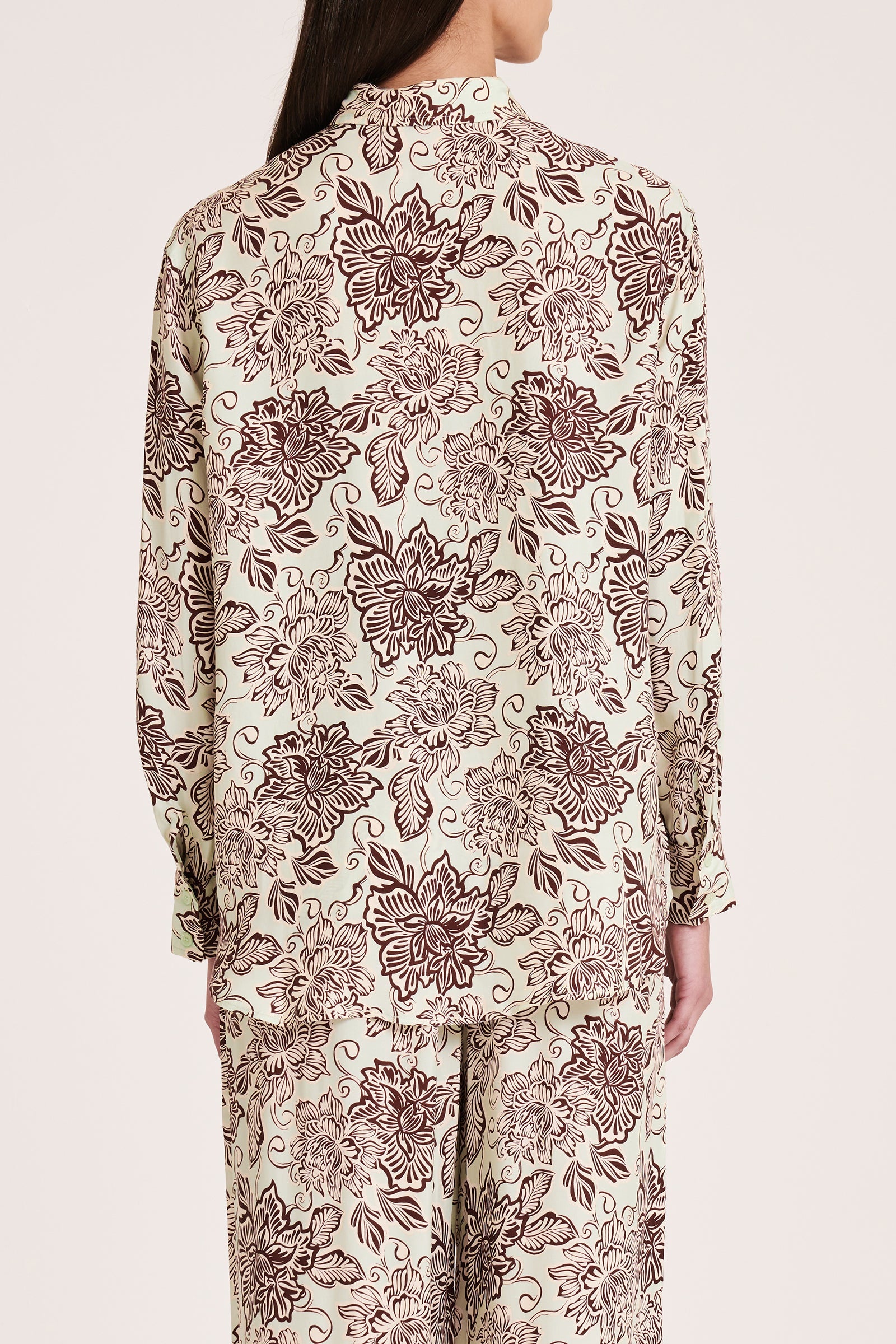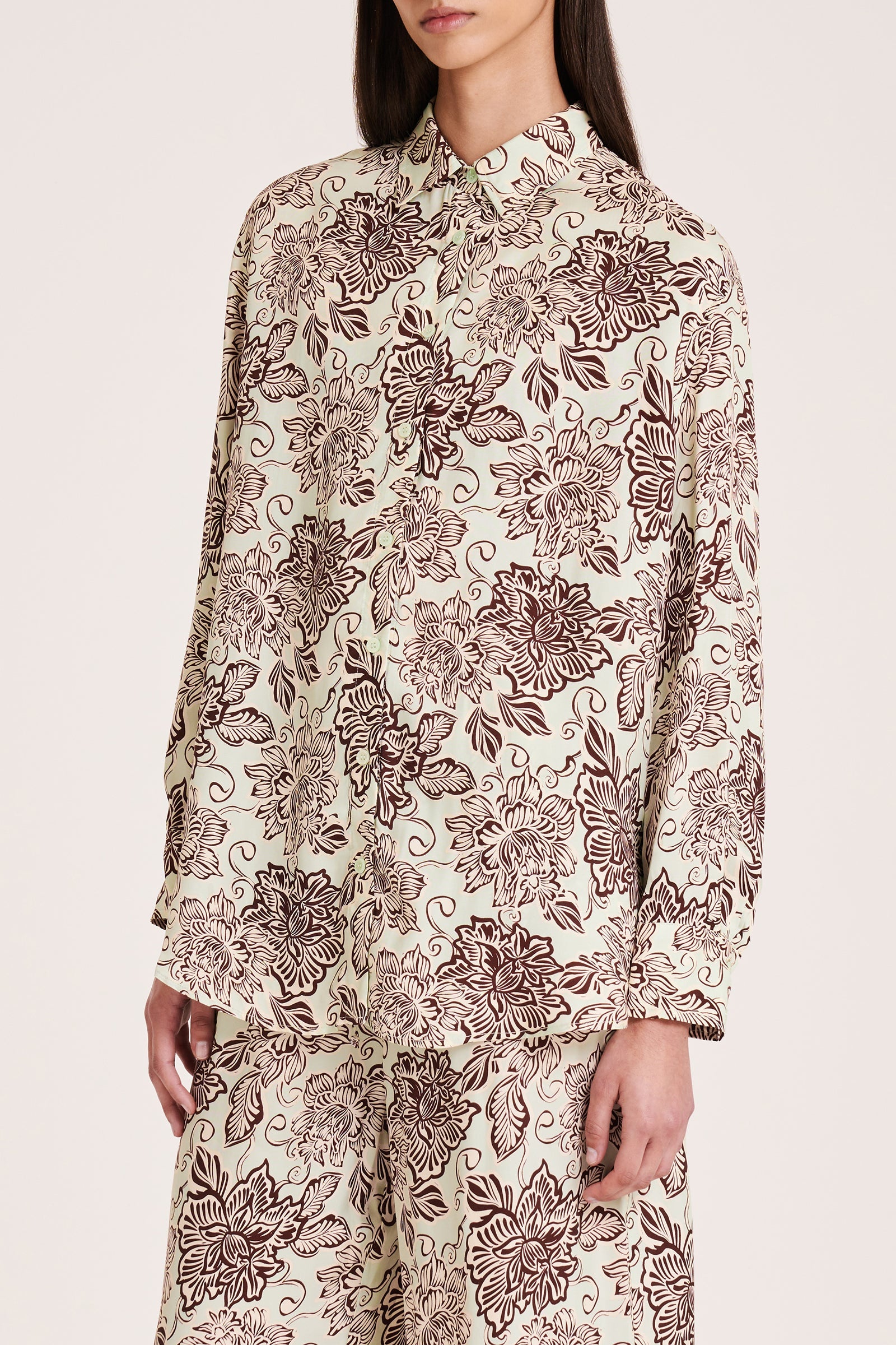 The Misi Cupro Shirt is made in our signature cupro fabrication in our exclusive Castillo print. The silhouette is relaxed with drop shoulders and a slightly oversized body. Classic shirting features include a front patch pocket, traditional shirt collar and front button opening, and a curved hem shape.