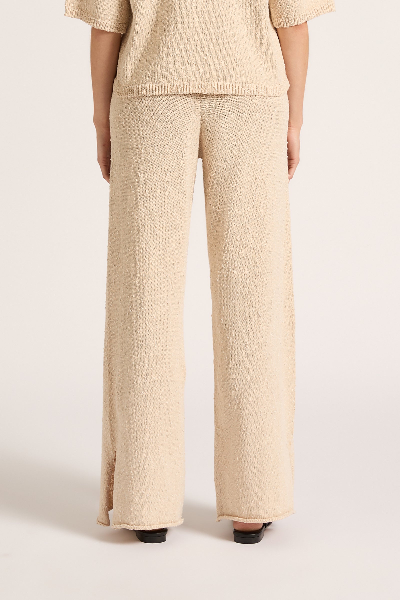 The Monte Knit Pant is made from a lightweight cotton blend yarn which has a dry textured hand feel. The silhouette is a relaxed wide leg, full length pant. Features include thick elasticated waistband.