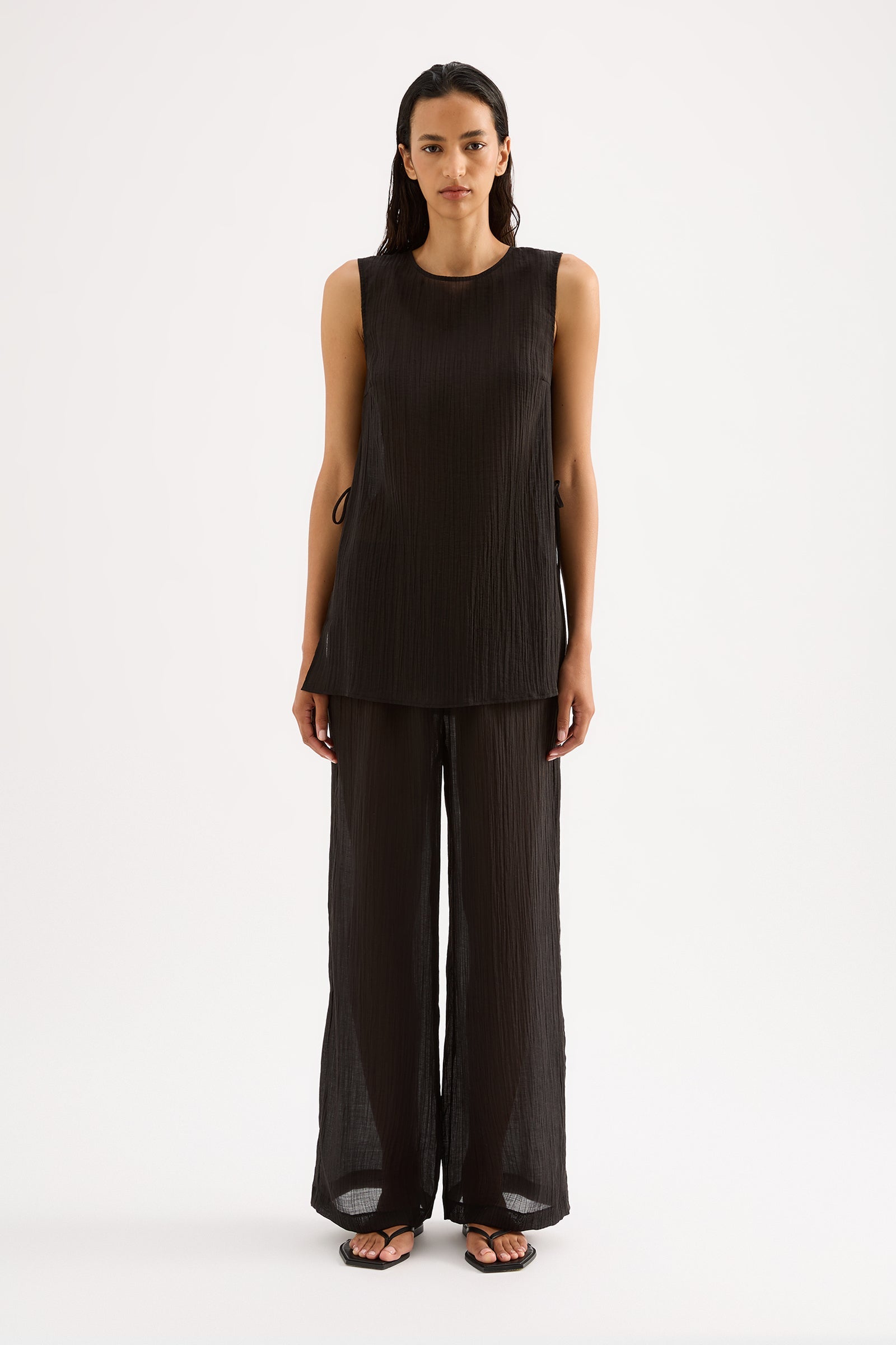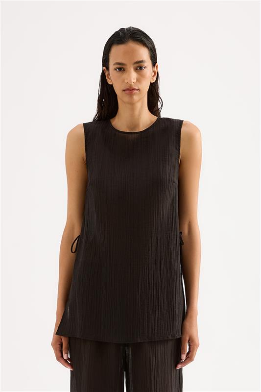 The Montego Tank is made from a lightweight, crinkled fabric which has a dry hand feel. The silhouette is relaxed with length finishing just below the hips. Features include crew neckline, side seam slits with ties and a keyhole opening at centre back.