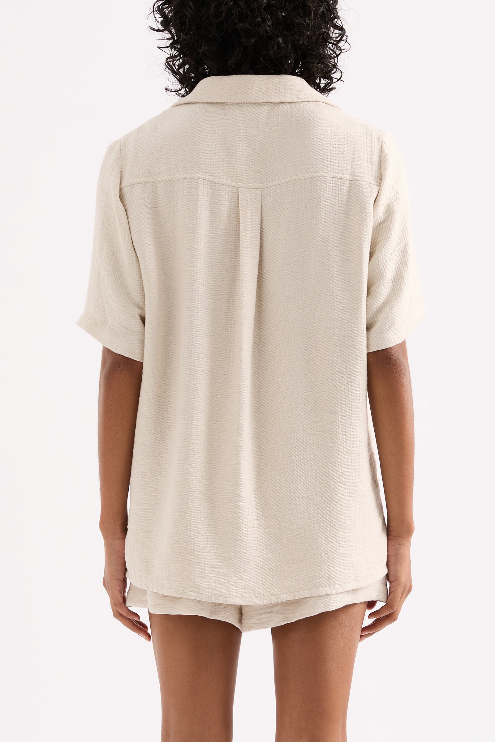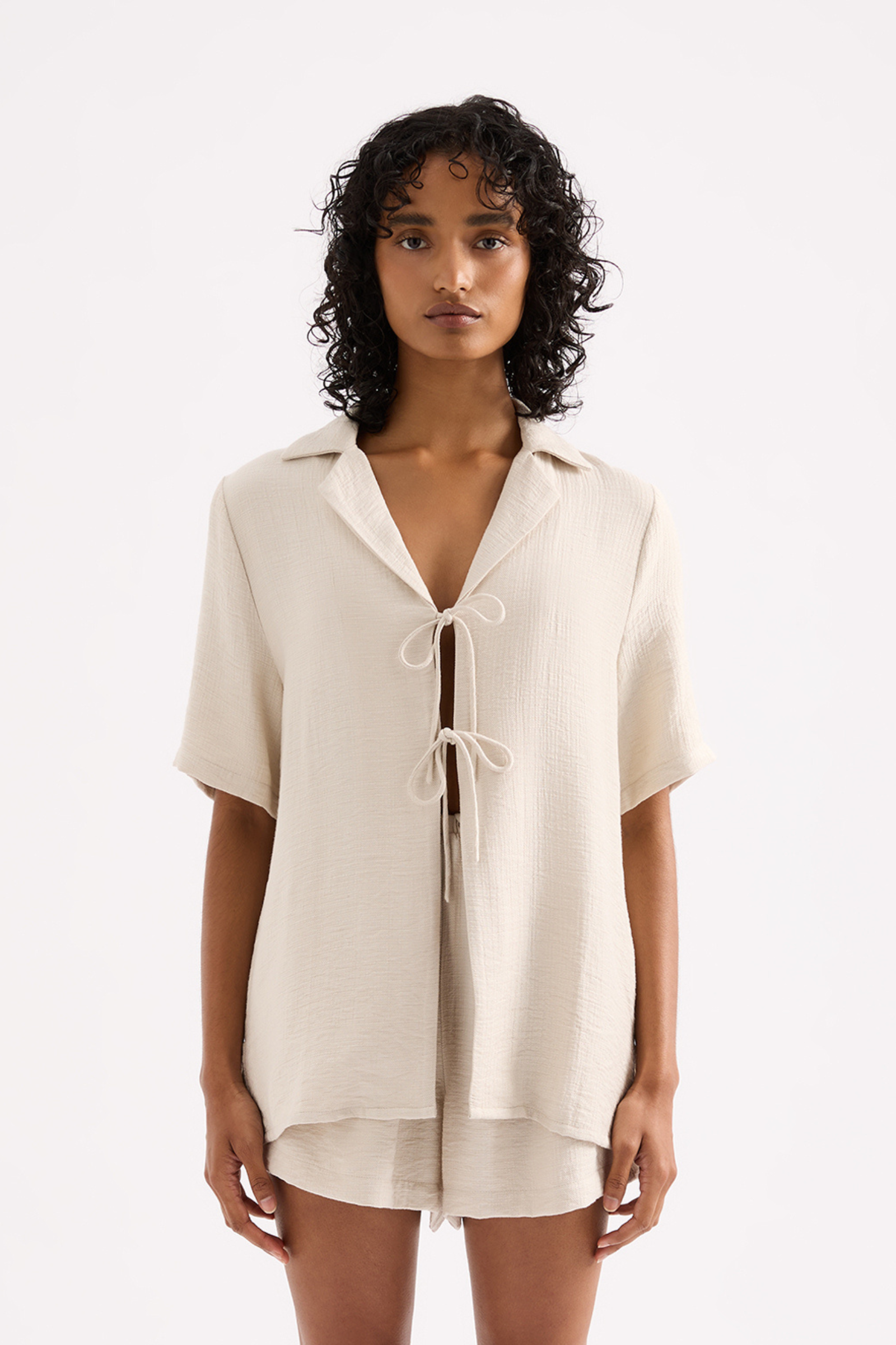 The Neve Shirt is made from a lightweight fabrication that has a soft, textured hand feel. The silhouette is an oversized fit, with length finishing at the hip. Features include classic shirting details, front tie closure and slits at hem.