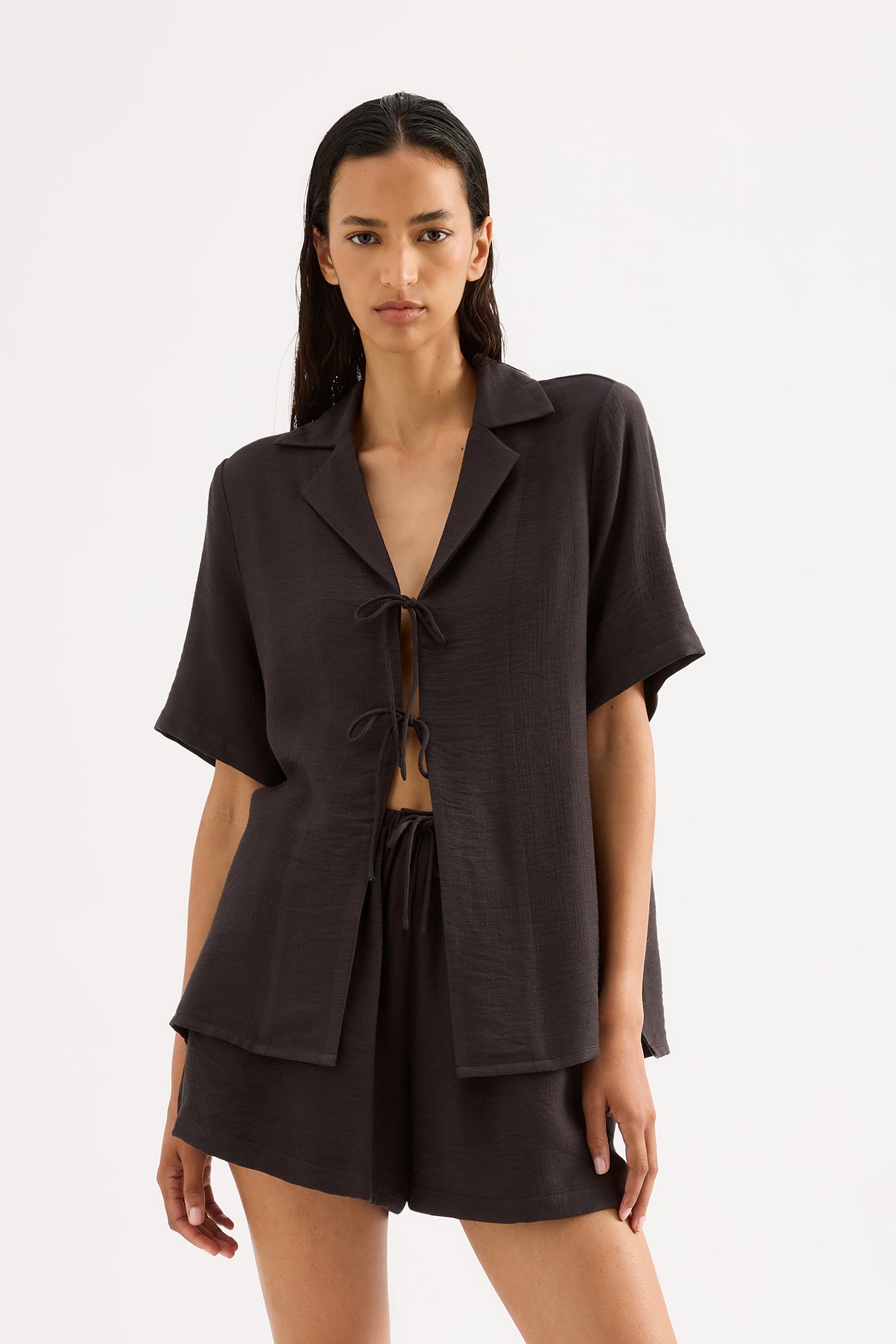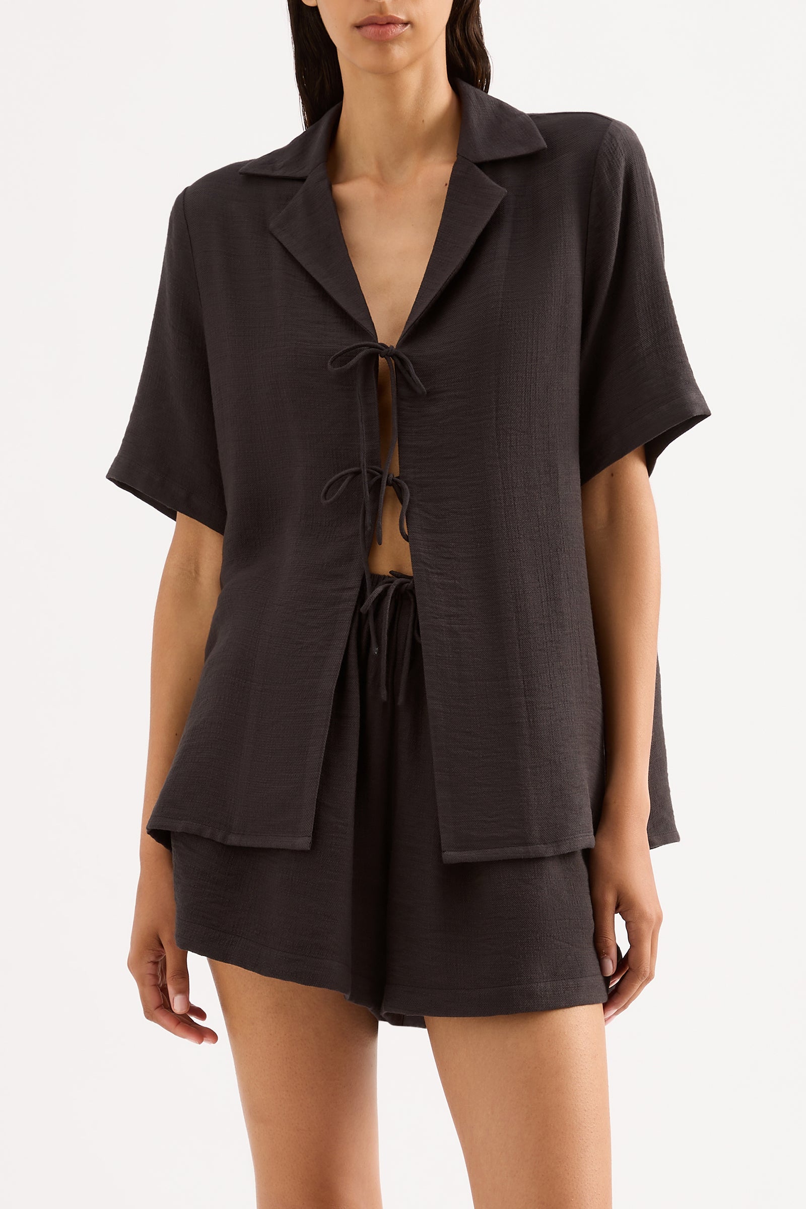 The Neve Shirt is made from a lightweight fabrication that has a soft, textured hand feel. The silhouette is an oversized fit, with length finishing at the hip. Features include classic shirting details, front tie closure and slits at hem.