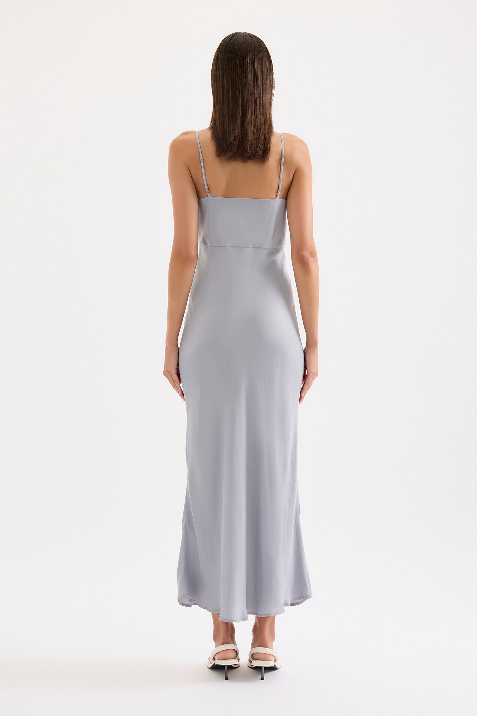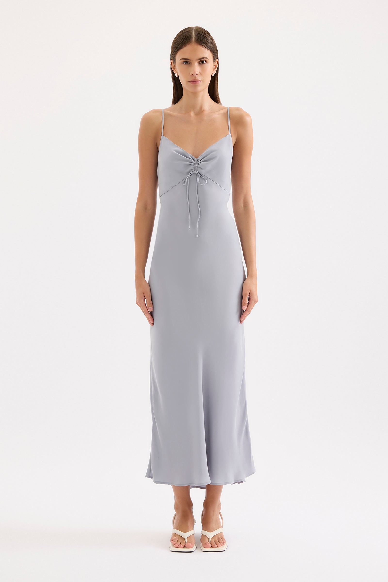 The Nikkia Cupro Maxi Dress in storm is made in our signature cupro fabric with a soft, sueded hand feel. Cut on the bias, this silhouette drapes over the body softly and finishes ankle length. Features include a v neckline with an adjustable gathered bodice at centre front which allows for versatility in wear and adjustable thin straps.