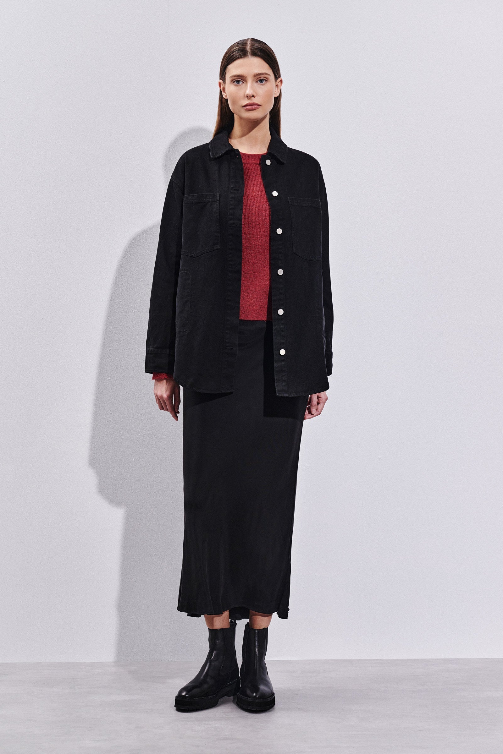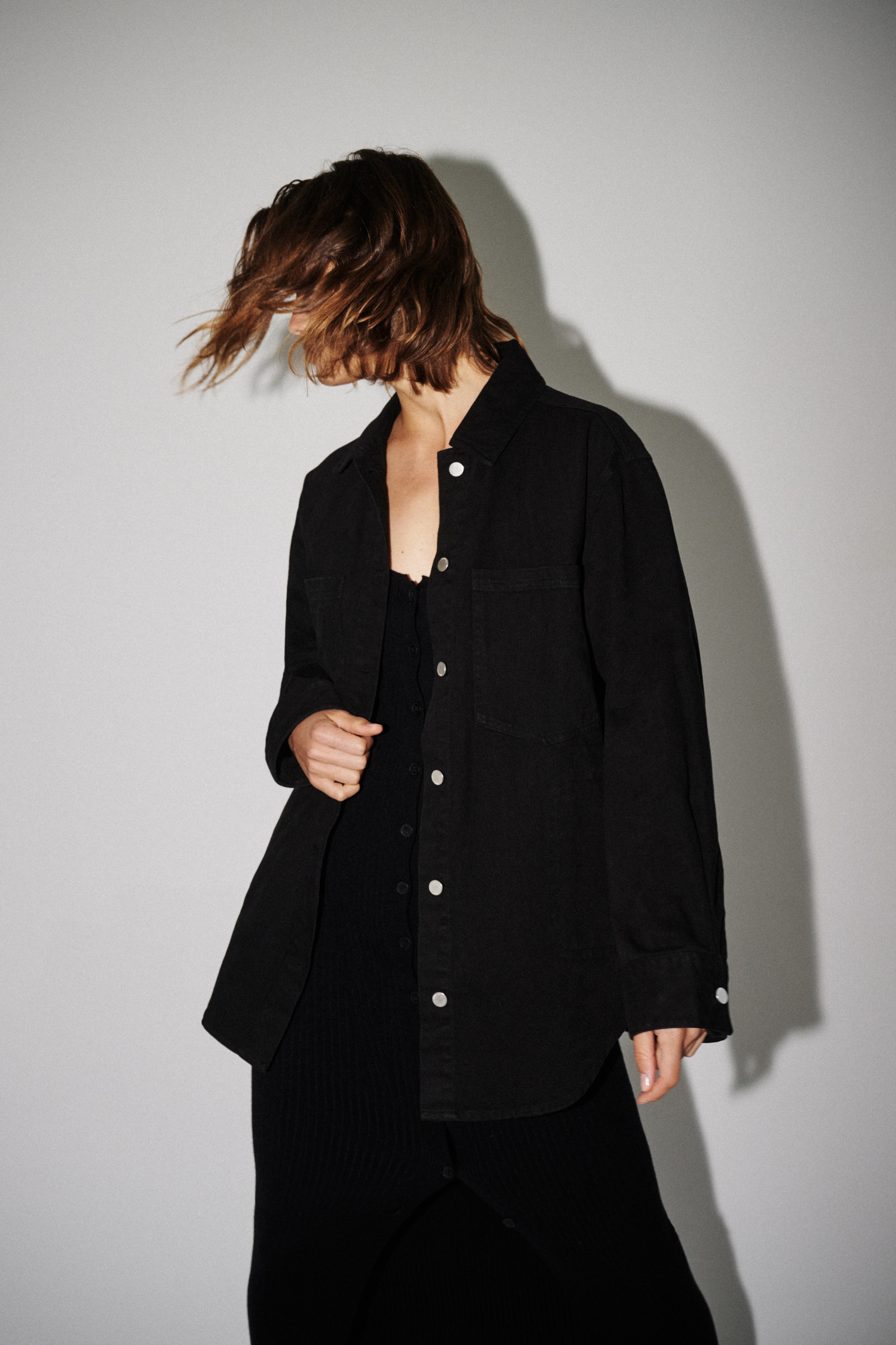 Noa Denim Jacket is made in cotton washed denim with a dry handfeel. The silhouette is a oversized outerwear shape with length finishing below the hips.  Features include a classic jacket collar, front pockets at chest height and side seam pockets with topstich detailing. Finished with a curved hemline and signature Nude Lucy shank buttons on the centre front and cuffs.
