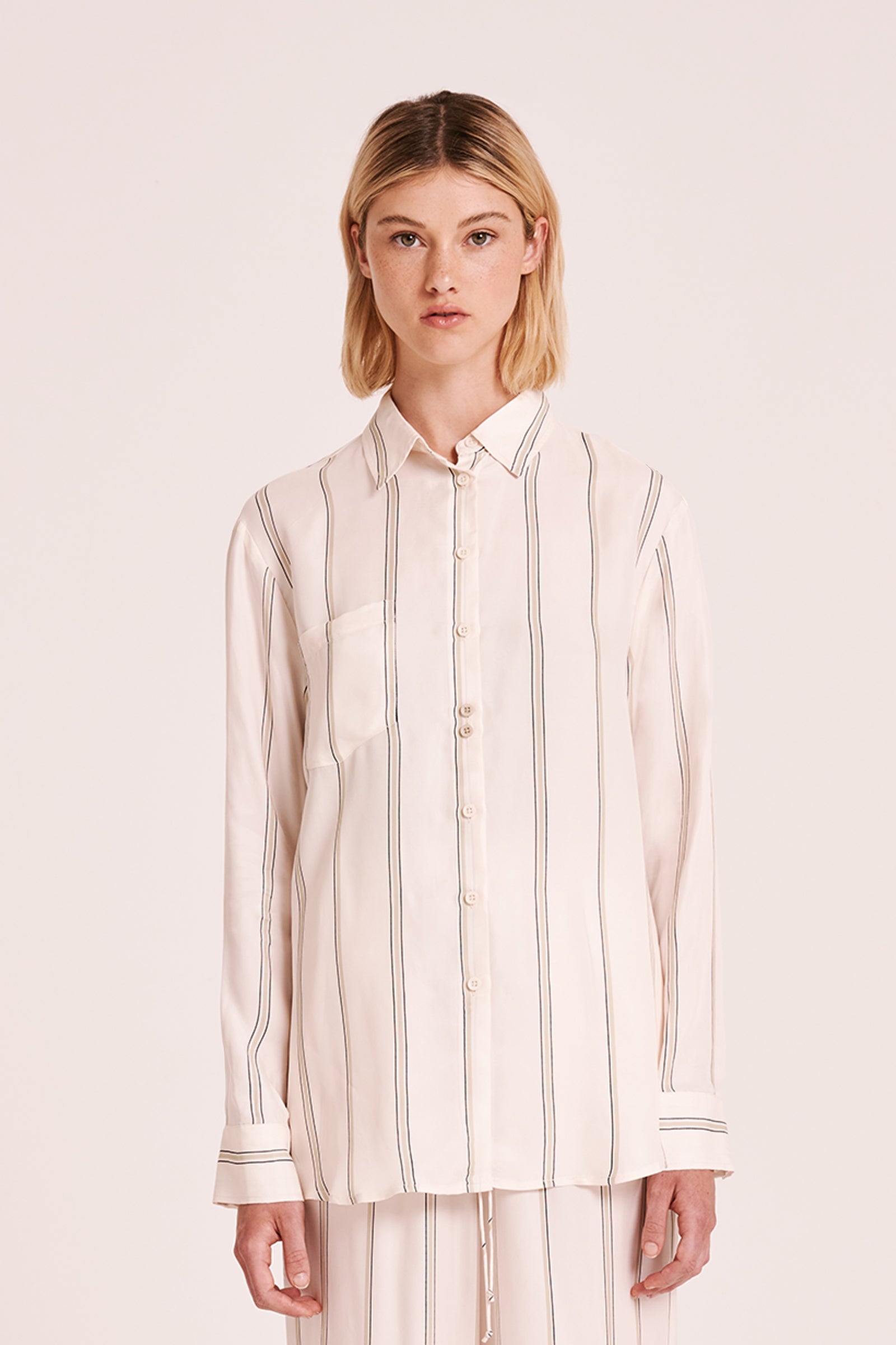 The Noosha Cupro LS Shirt is made in our signature cupro fabrication in our exclusive Paloma print. The silhouette is relaxed and oversized through the body with the length finishing below the hips. Features include classic shirt detailing with front patch pocket and contrast button detail. Wear it open as a soft jacket or layering piece.