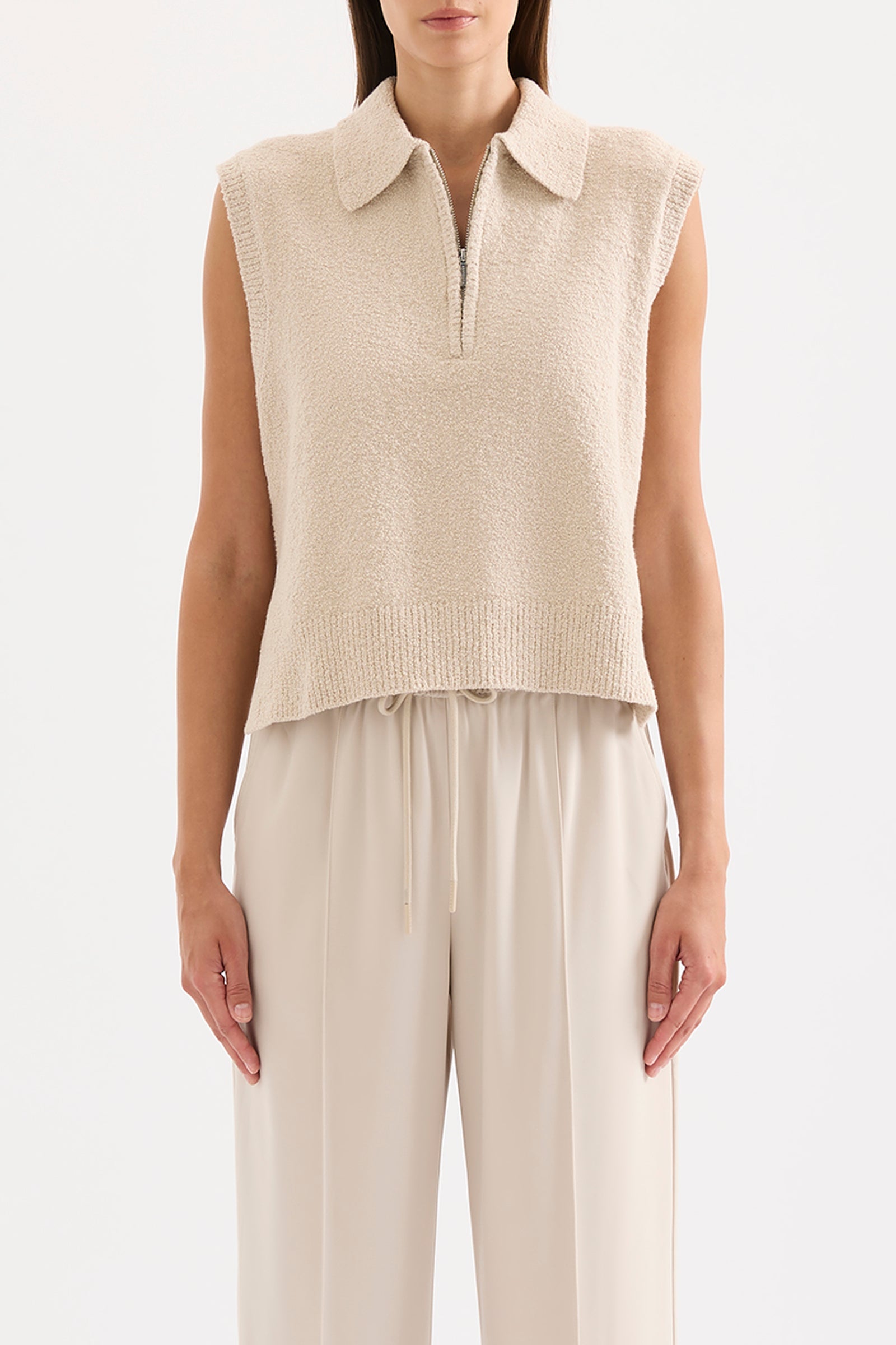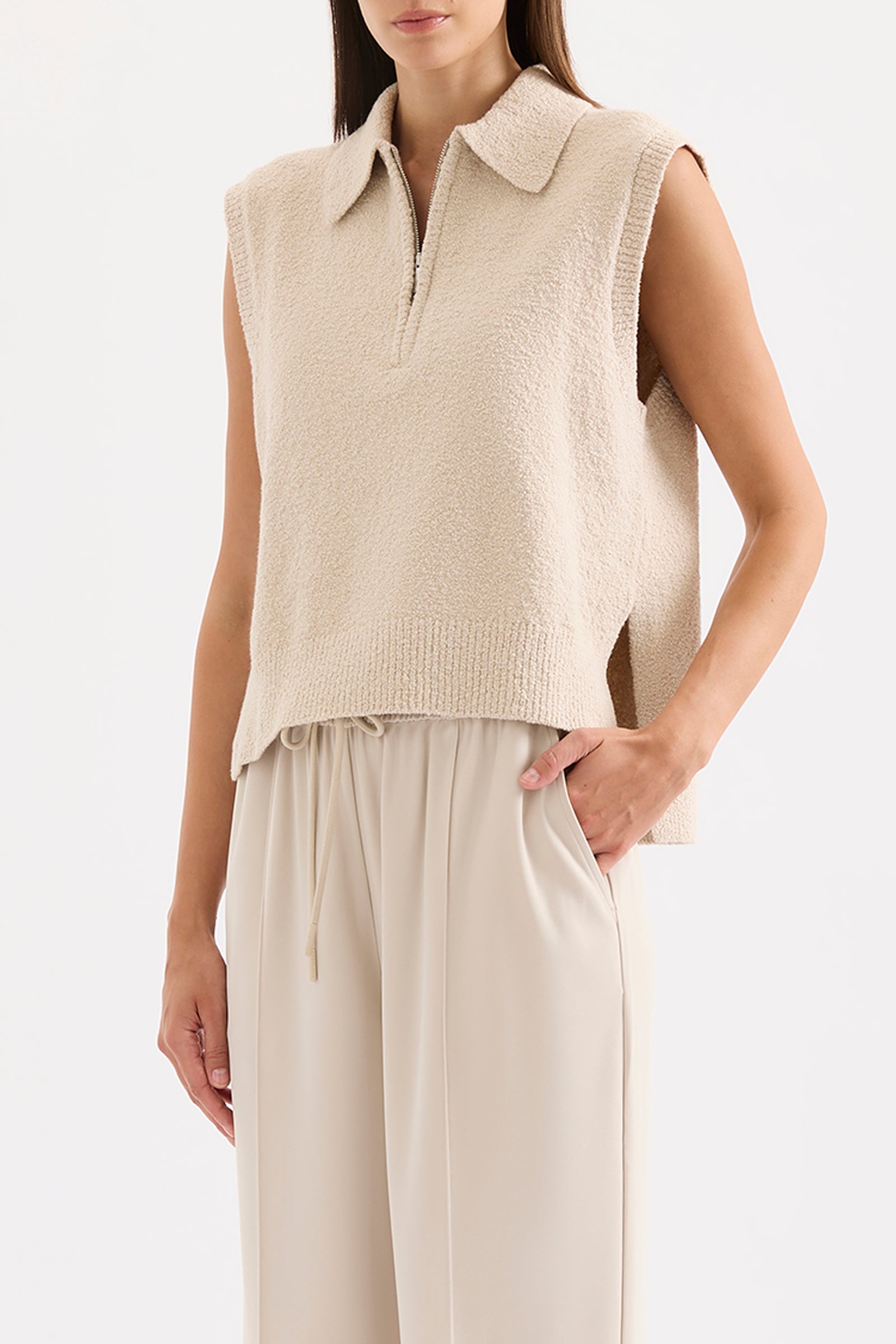 The Ordell Knit Vest is made from a cotton blend textured boucle yarn with a dry and cool handfeel. The silhouette is relaxed finishing at the hips. Features include a fully knitted rugby collar, with a branded exposed zipper opening at front chest  and a ribbed stepped hem with side slits.