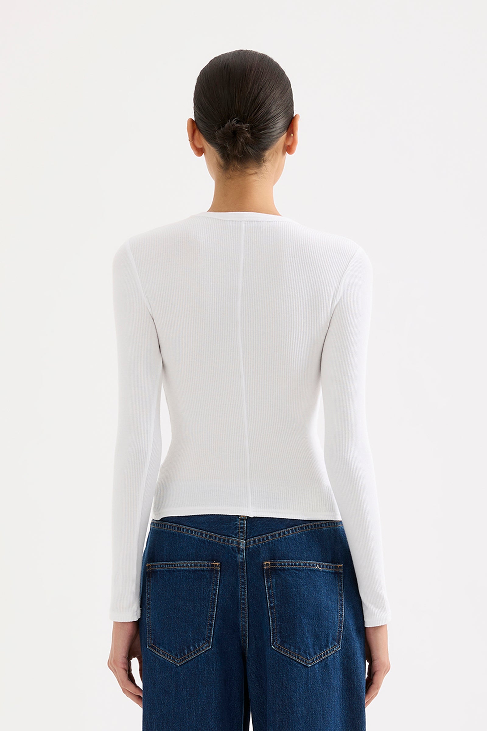 The Organic Rib LS Tee by Nude Lucy is a key piece to add to your basics wardrobe range. Made in organic cotton the silhouette is a flattering close fit. Featured include a crew neck, long fitted sleeves, and length finishing at the hip. This can be tucked in or worn over midrise bottoms.