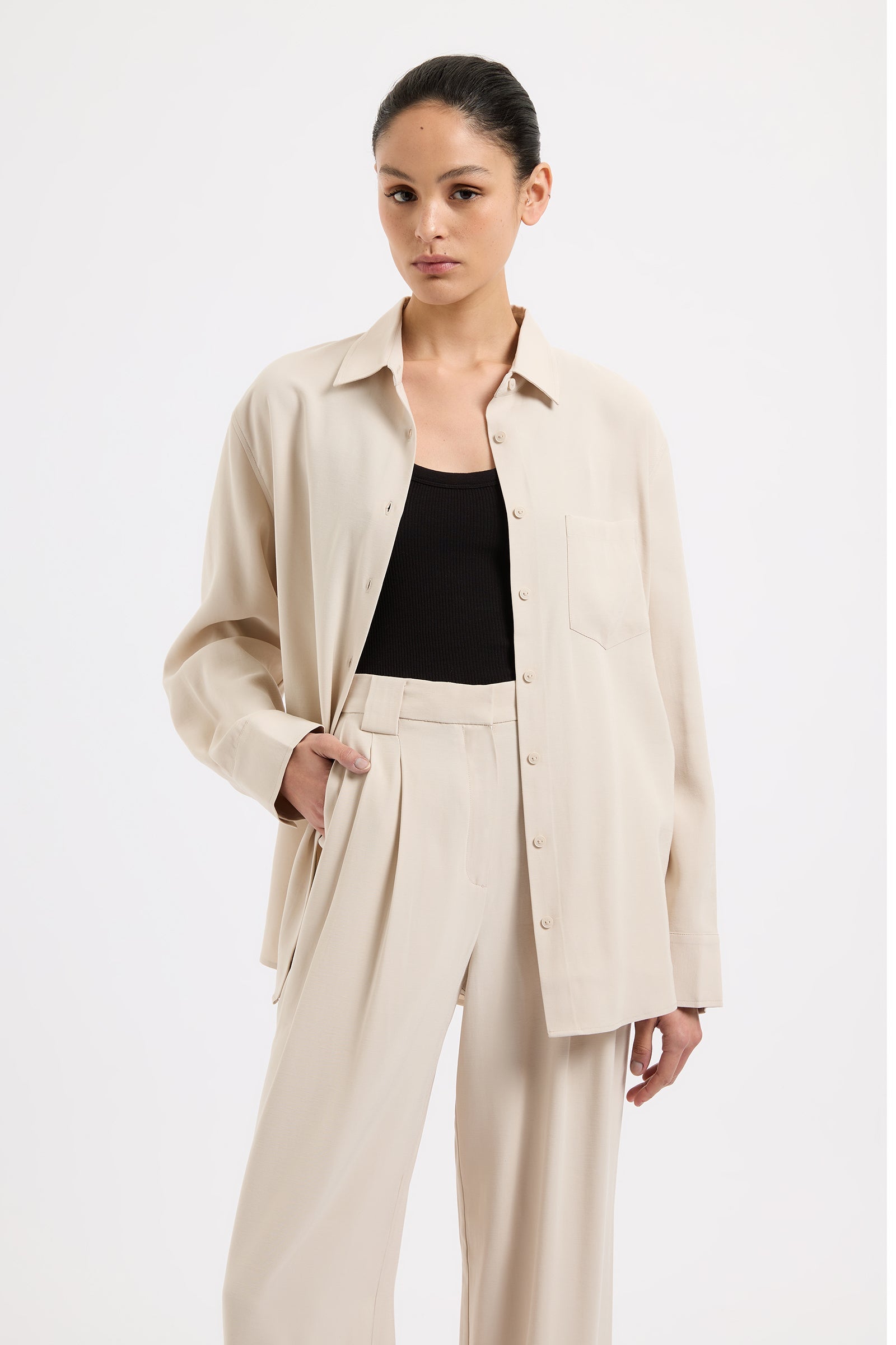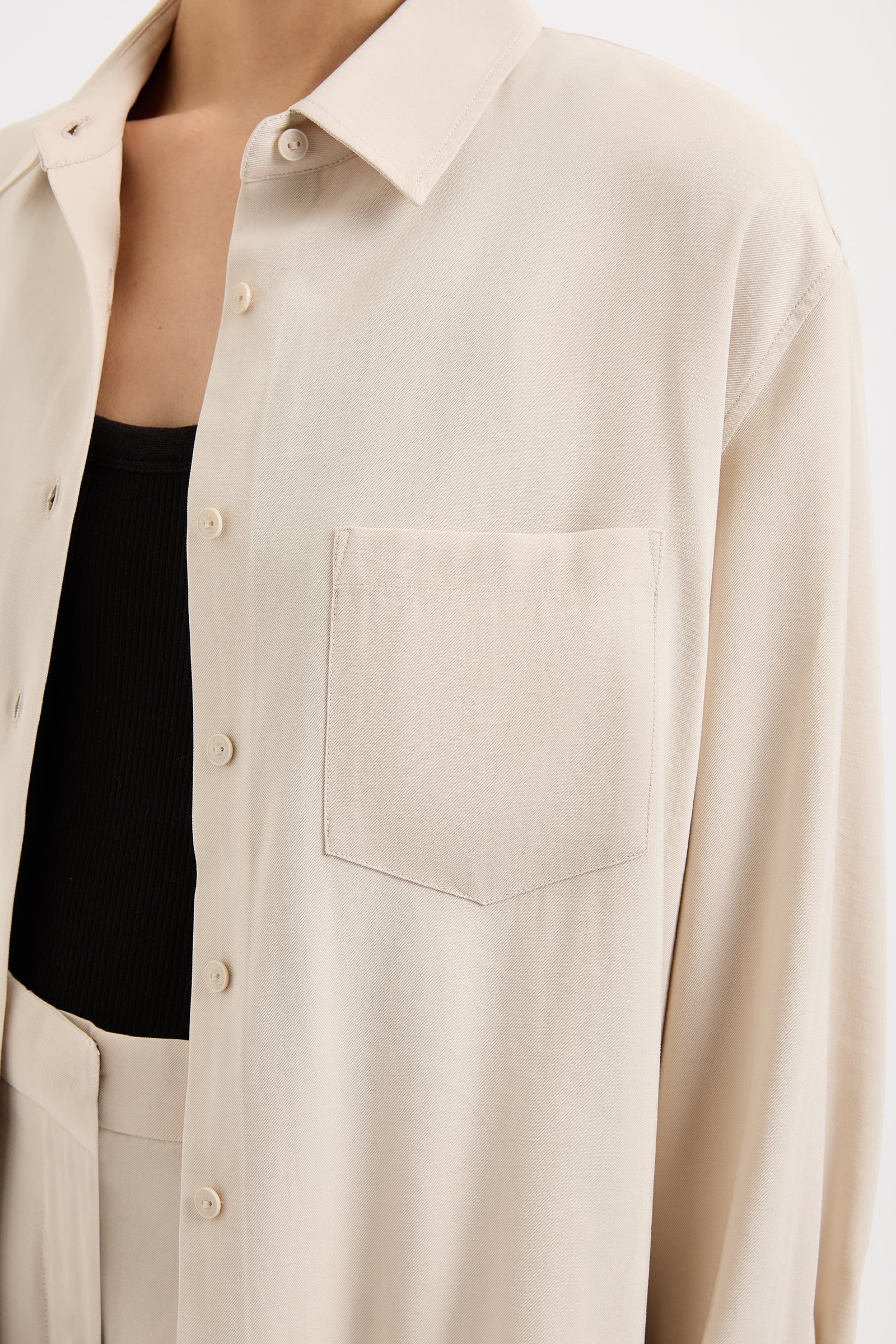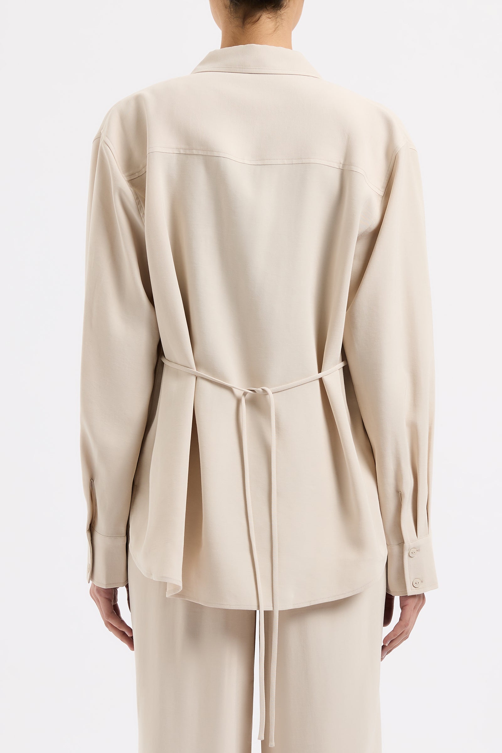 The Petra Shirt is made in a lightweight rayon fabrication that has a twill textural silhouette is relaxed with drop shoulders and a slightly oversized body. Classic shirting features include a front patch pocket, traditional shirt collar and front button opening, a curved hem shape and waist tie