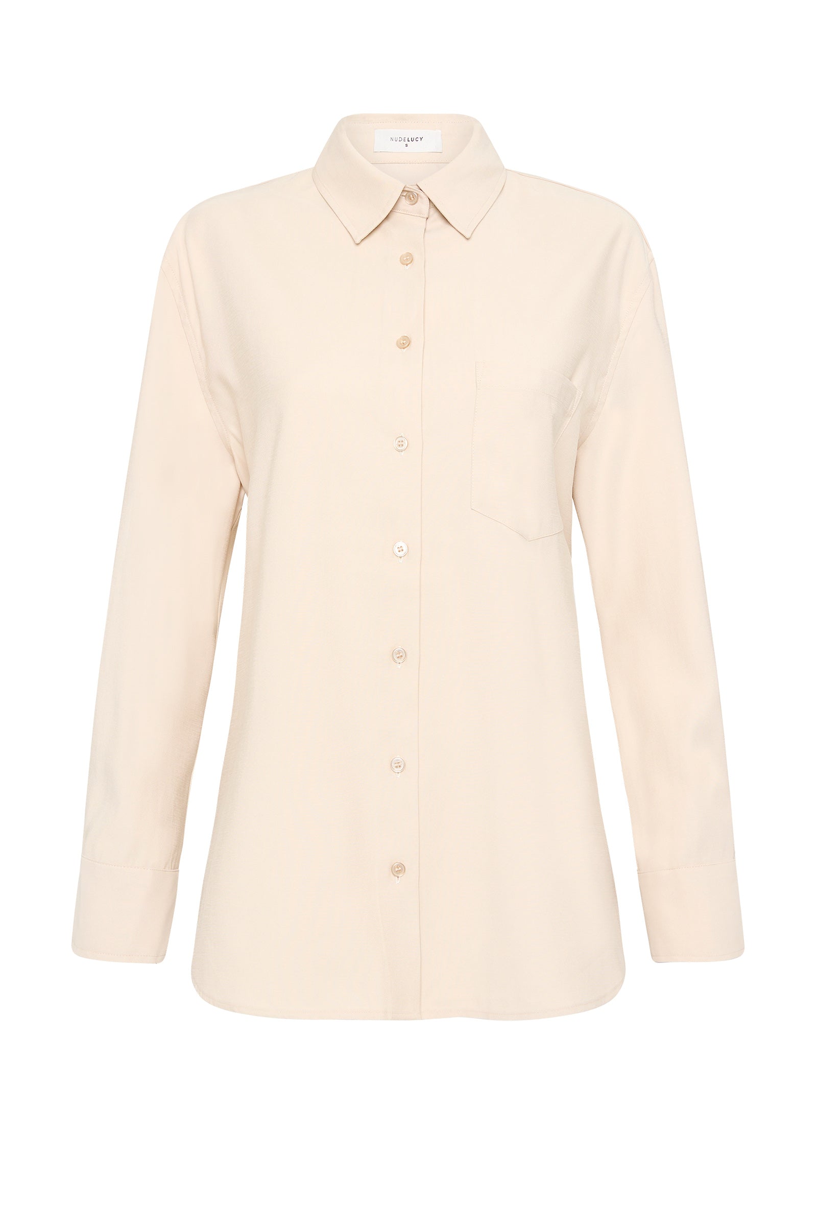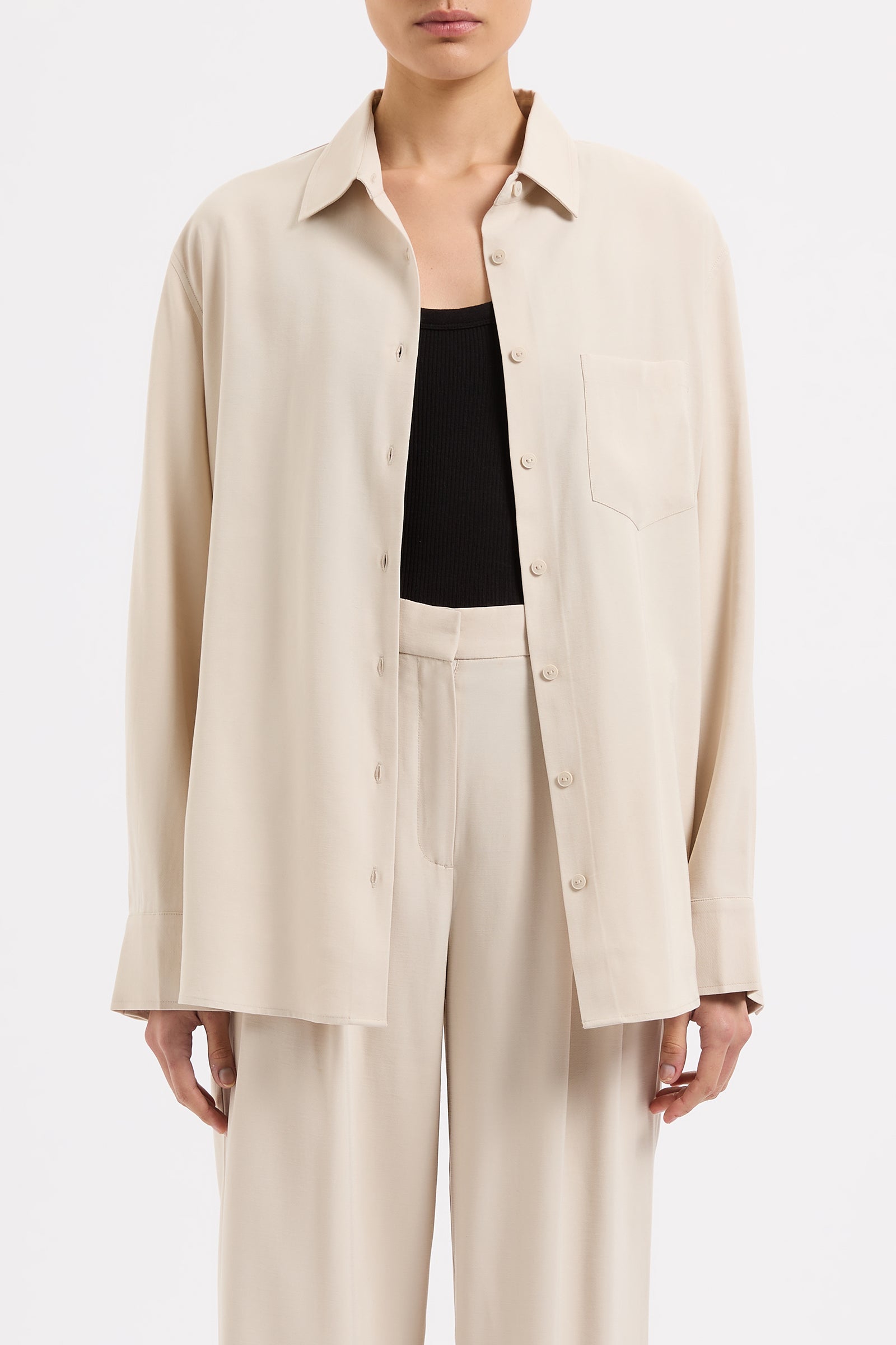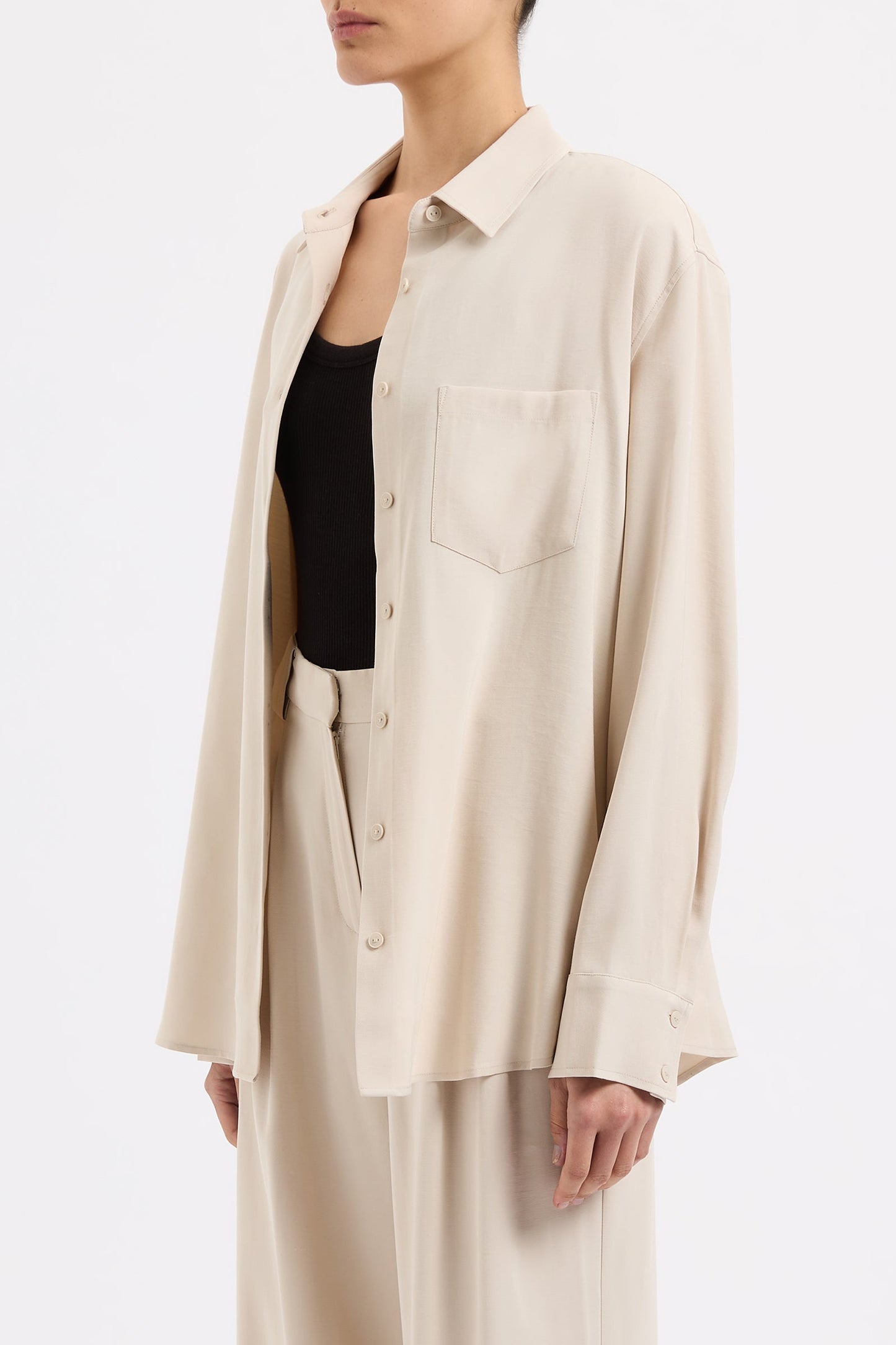 The Petra Shirt is made in a lightweight rayon fabrication that has a twill textural silhouette is relaxed with drop shoulders and a slightly oversized body. Classic shirting features include a front patch pocket, traditional shirt collar and front button opening, a curved hem shape and waist tie