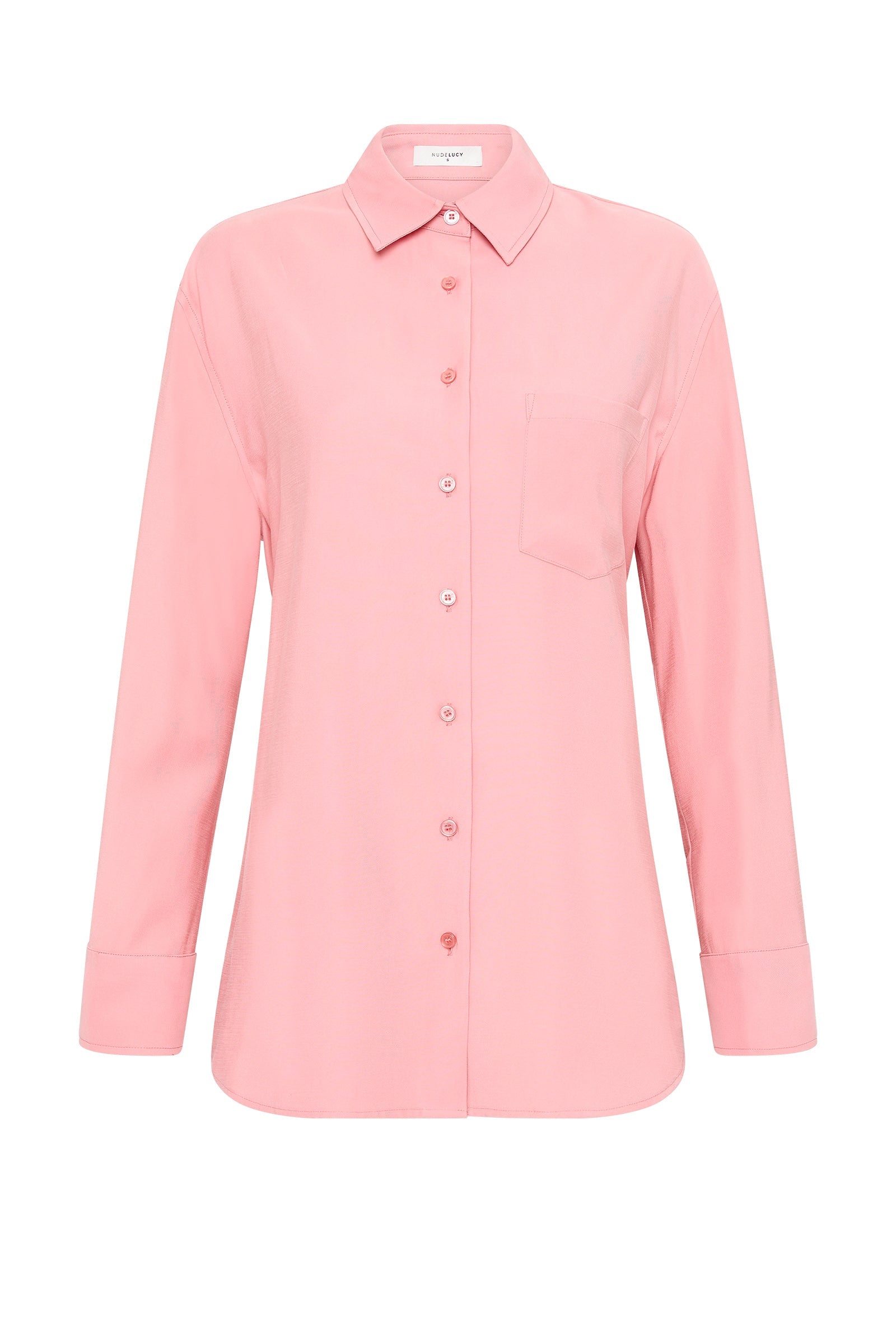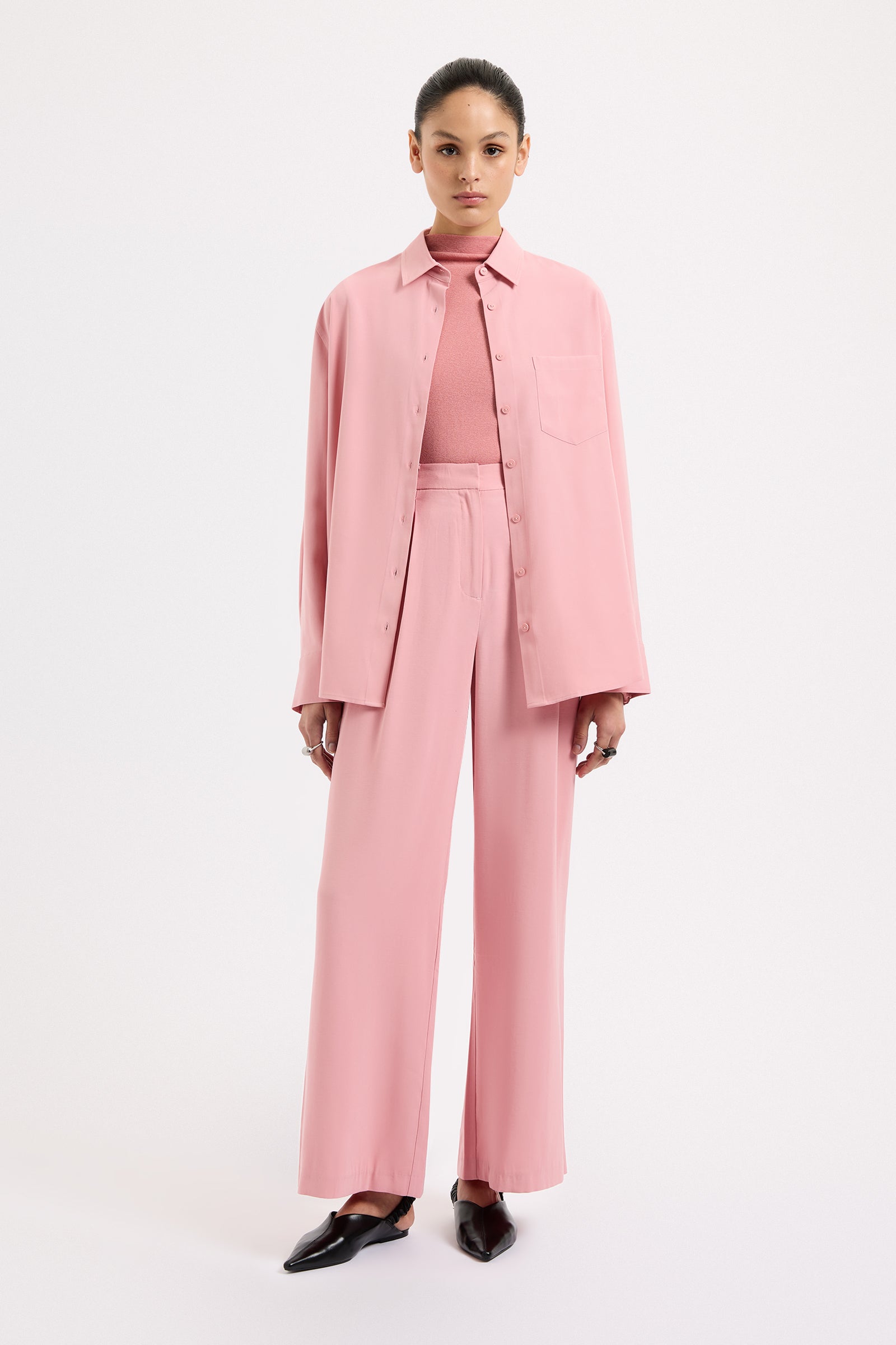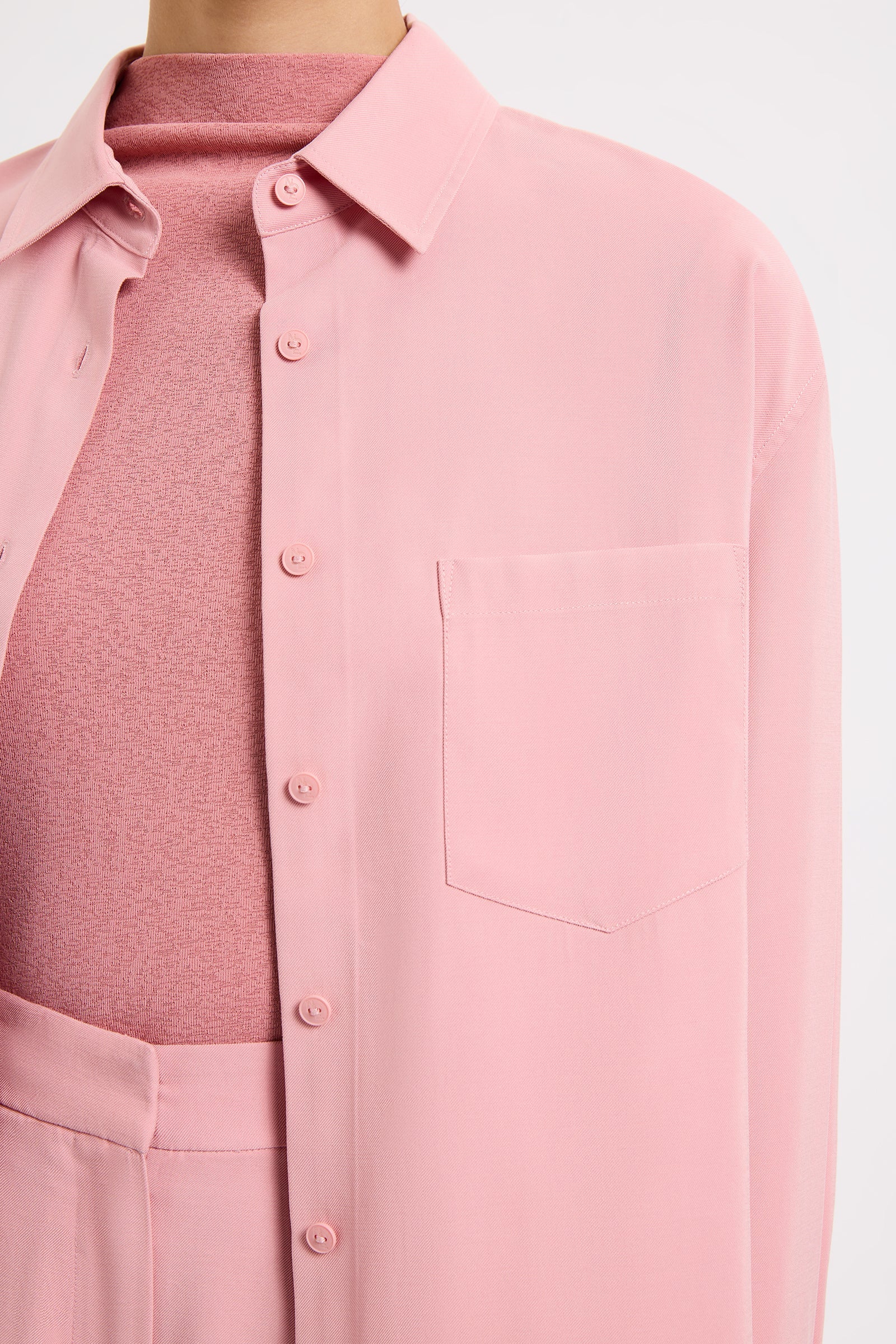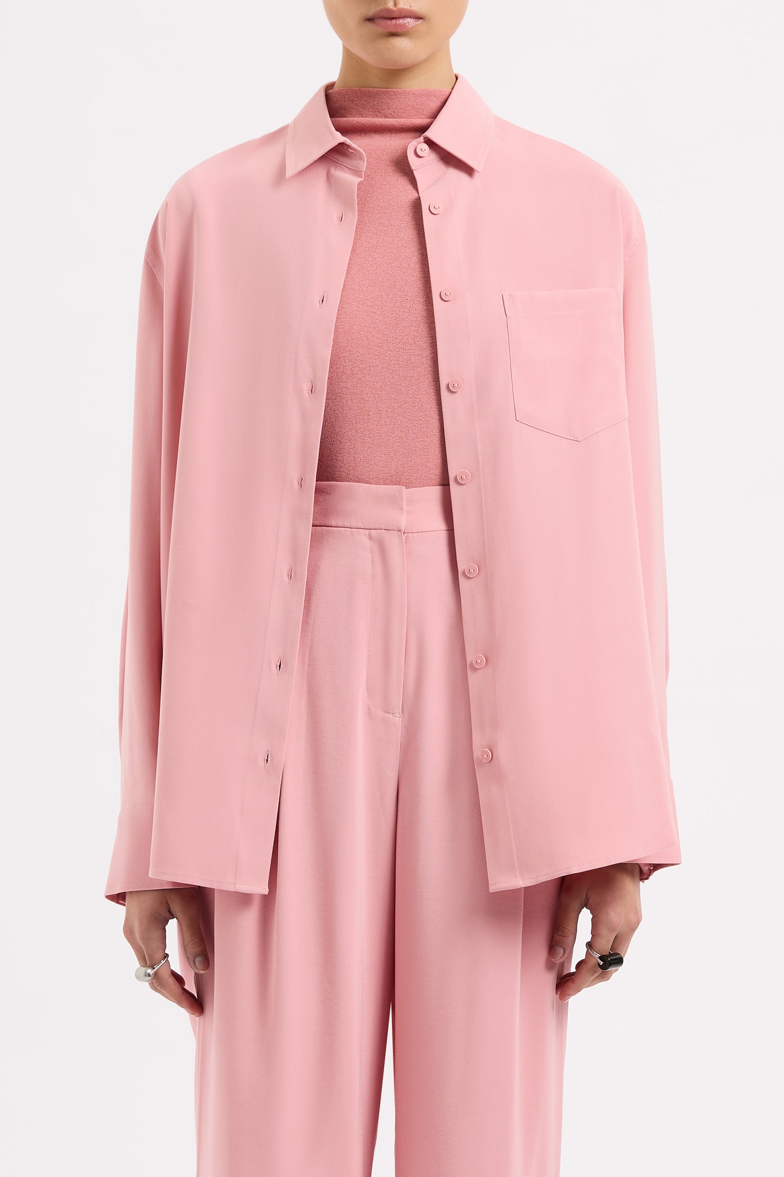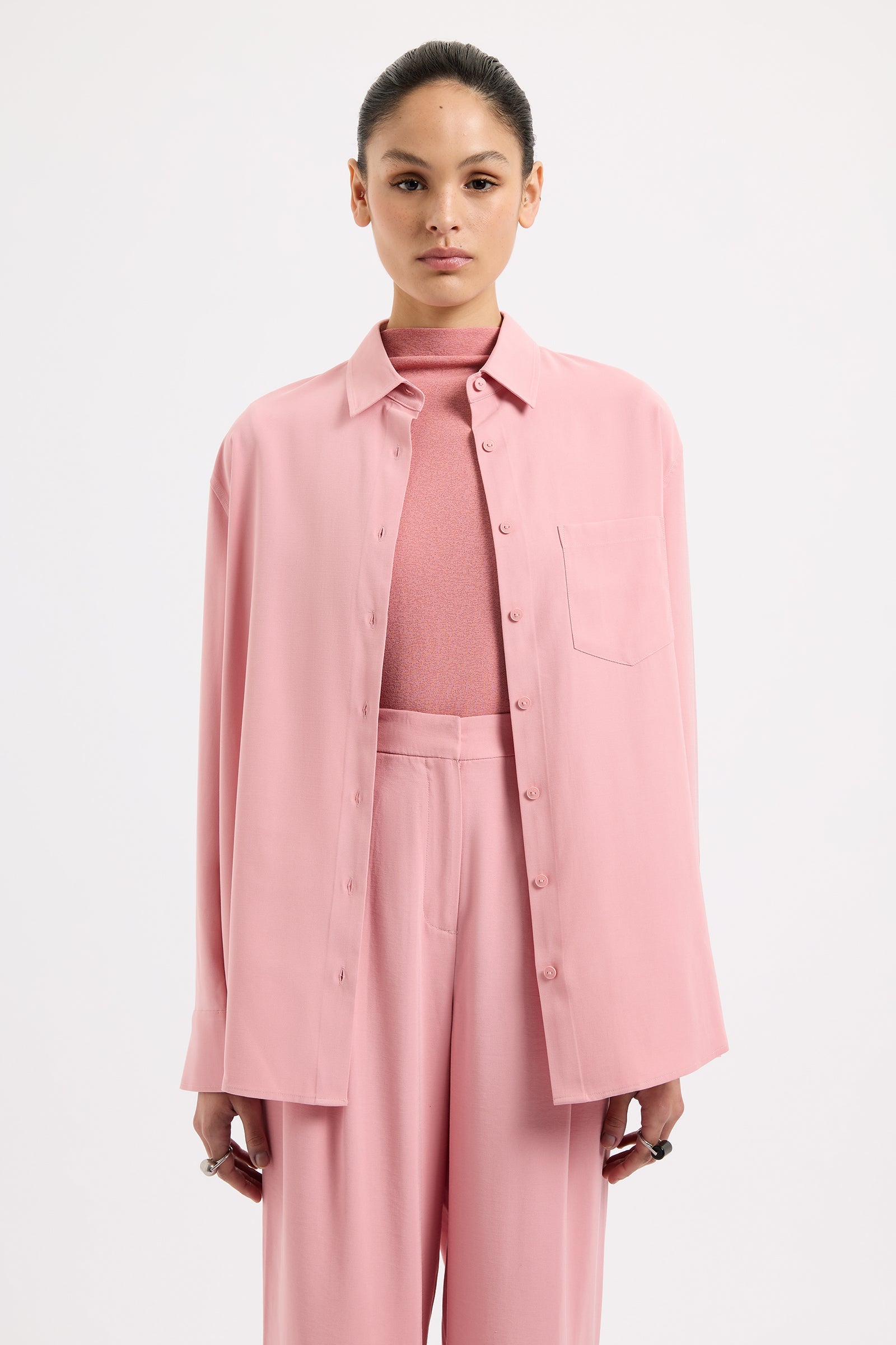 The Petra Shirt is made in a lightweight rayon fabrication that has a twill texture and soft hand feel. The silhouette is relaxed with drop shoulders and a slightly oversized body. Classic shirting features include a front patch pocket, traditional shirt collar and front branded button opening, a curved hem shape and waist tie.