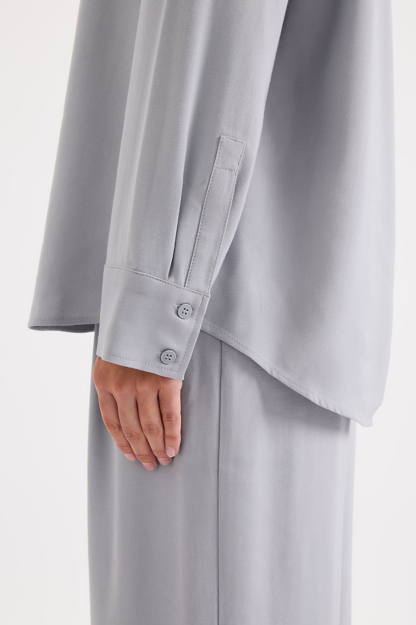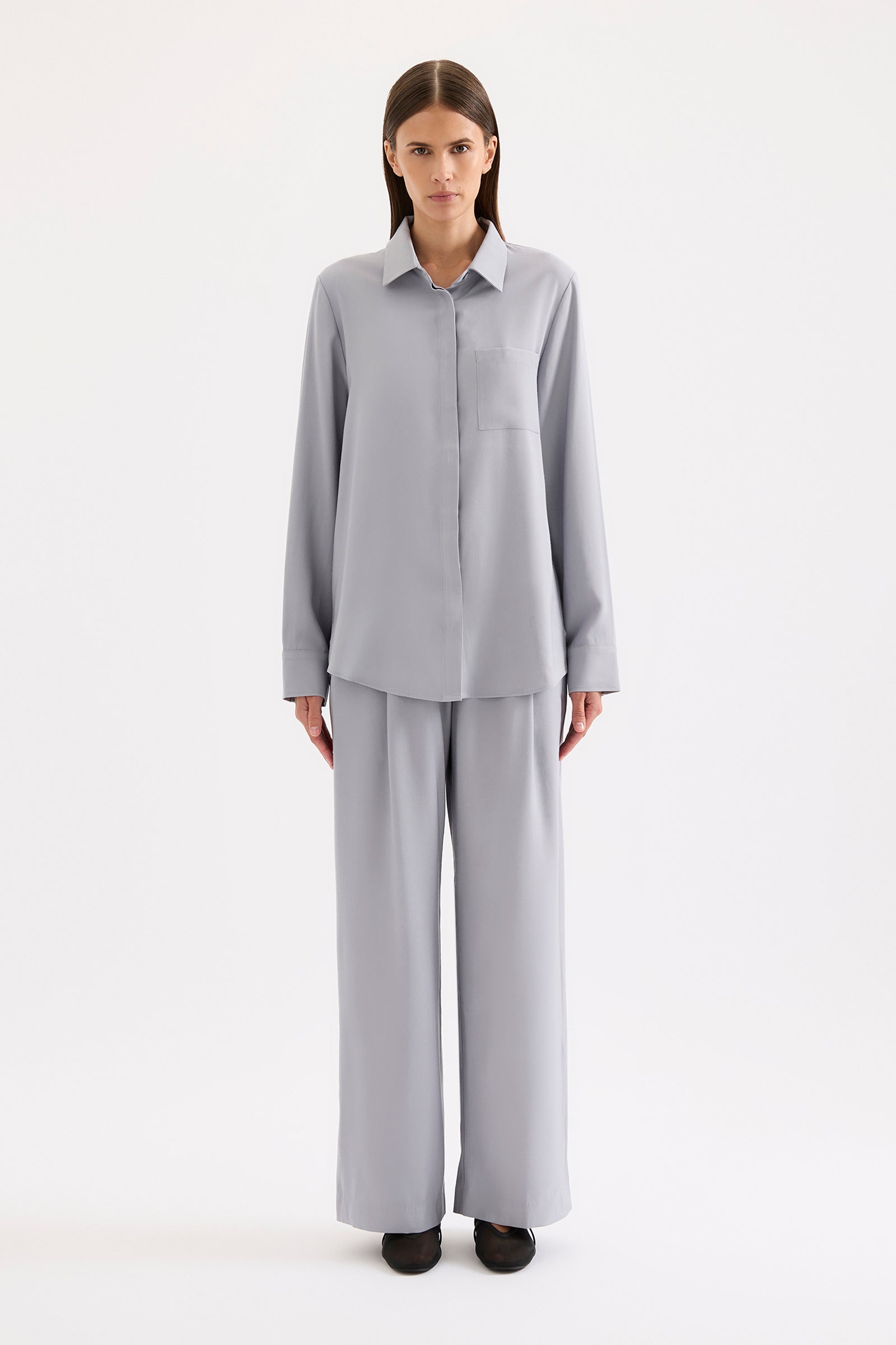 The Raine Shirt is made from a classic suiting fabrication that has a twill texture and a smooth hand feel. The silhouette is relaxed with drop shoulders and a slightly oversized body. Classic shirting features include a front patch pocket, traditional shirt collar and front branded button opening and a curved hem shape.