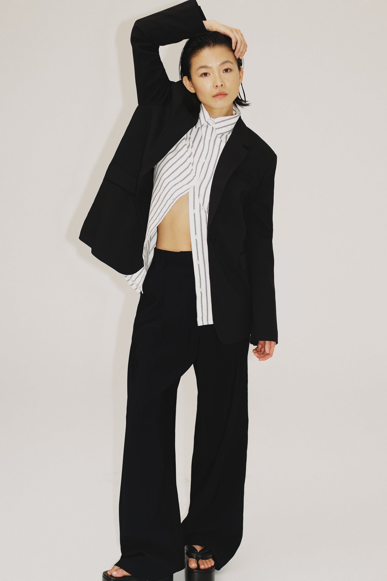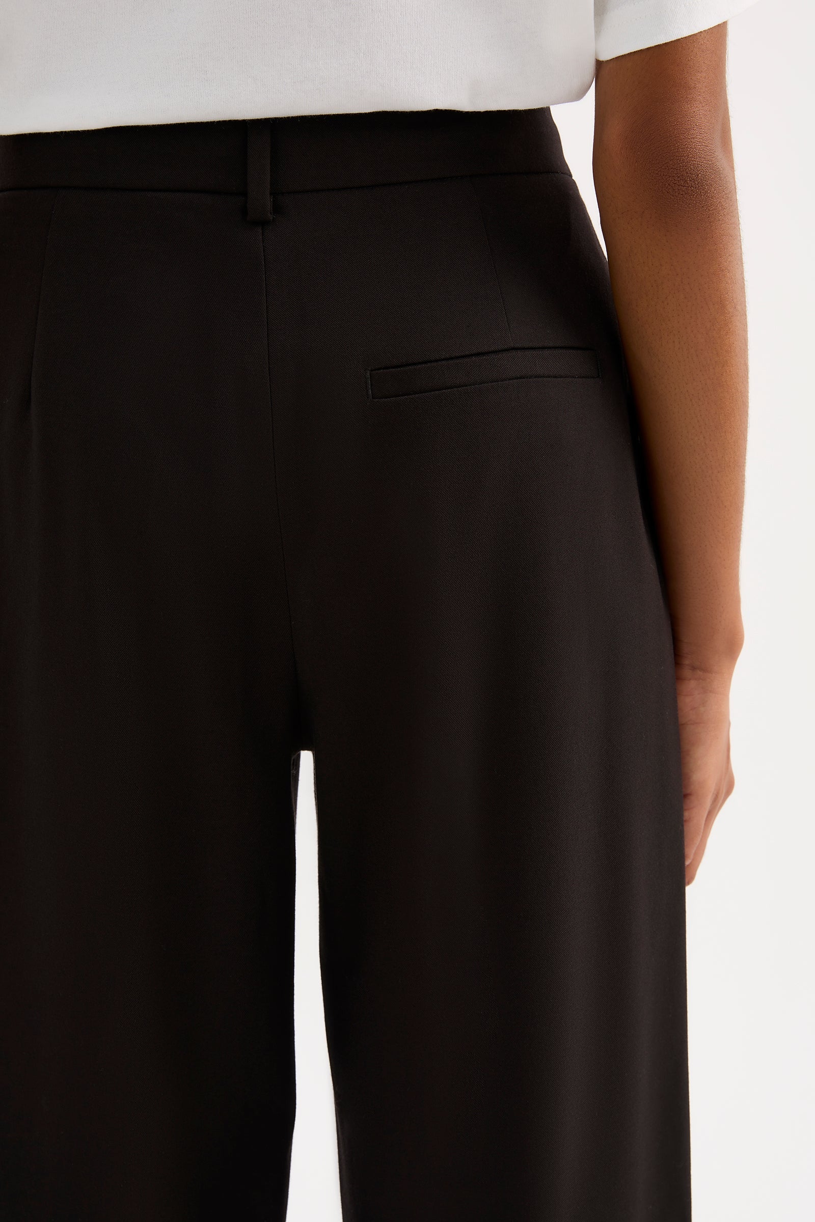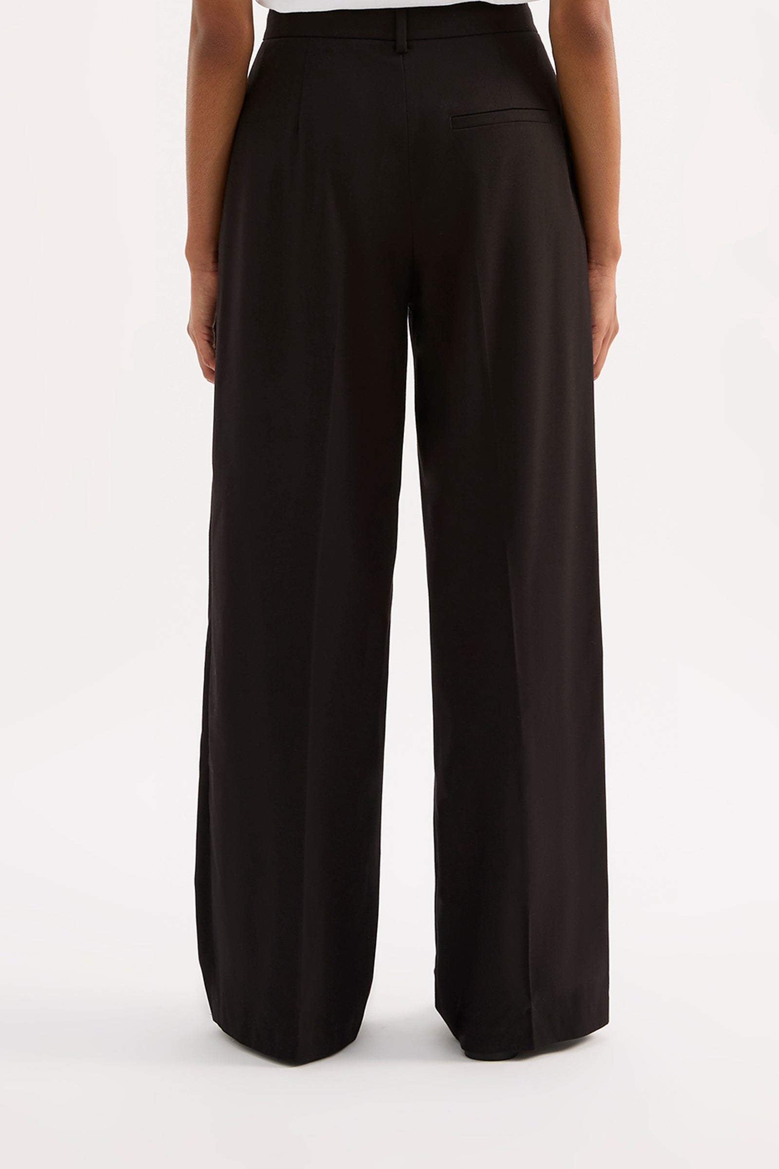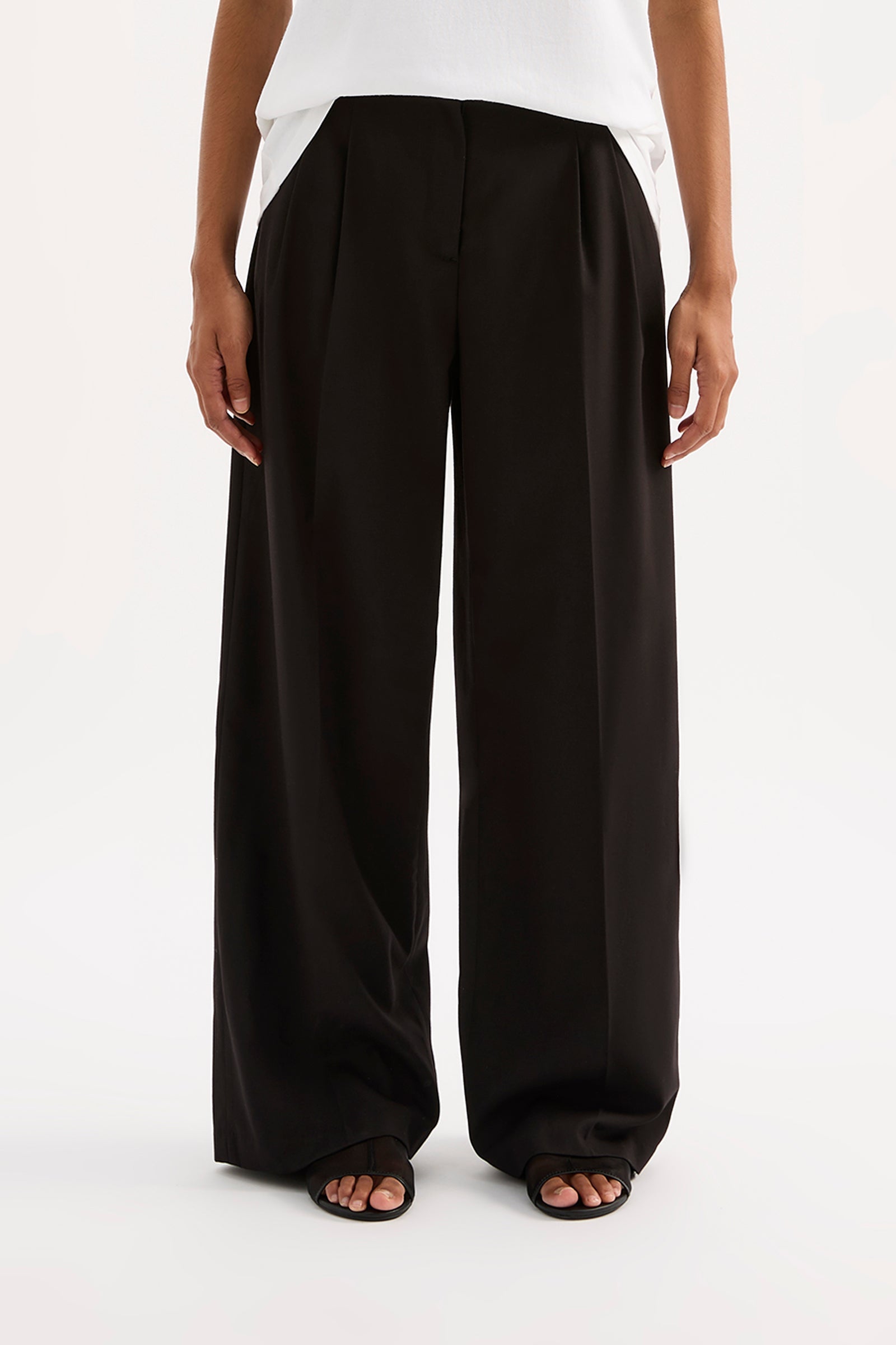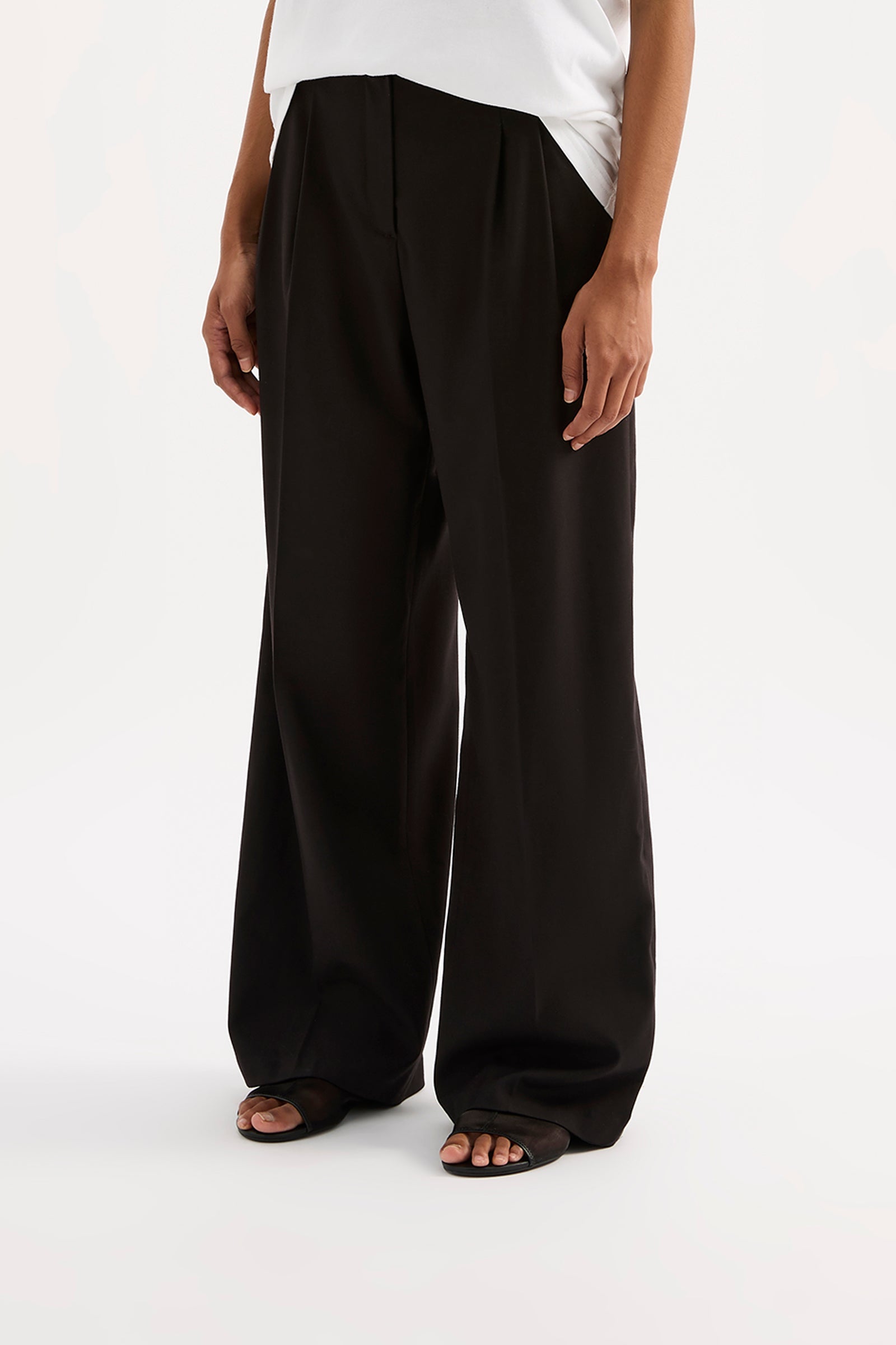 The Rana Pant is made from a classic wool blend suiting fabrication with a smooth hand feel. The silhouette is tailored with a high rise and wide leg. Features include front pleats at waist, concealed trouser hook closure and Nude Lucy branded internal waist banding.