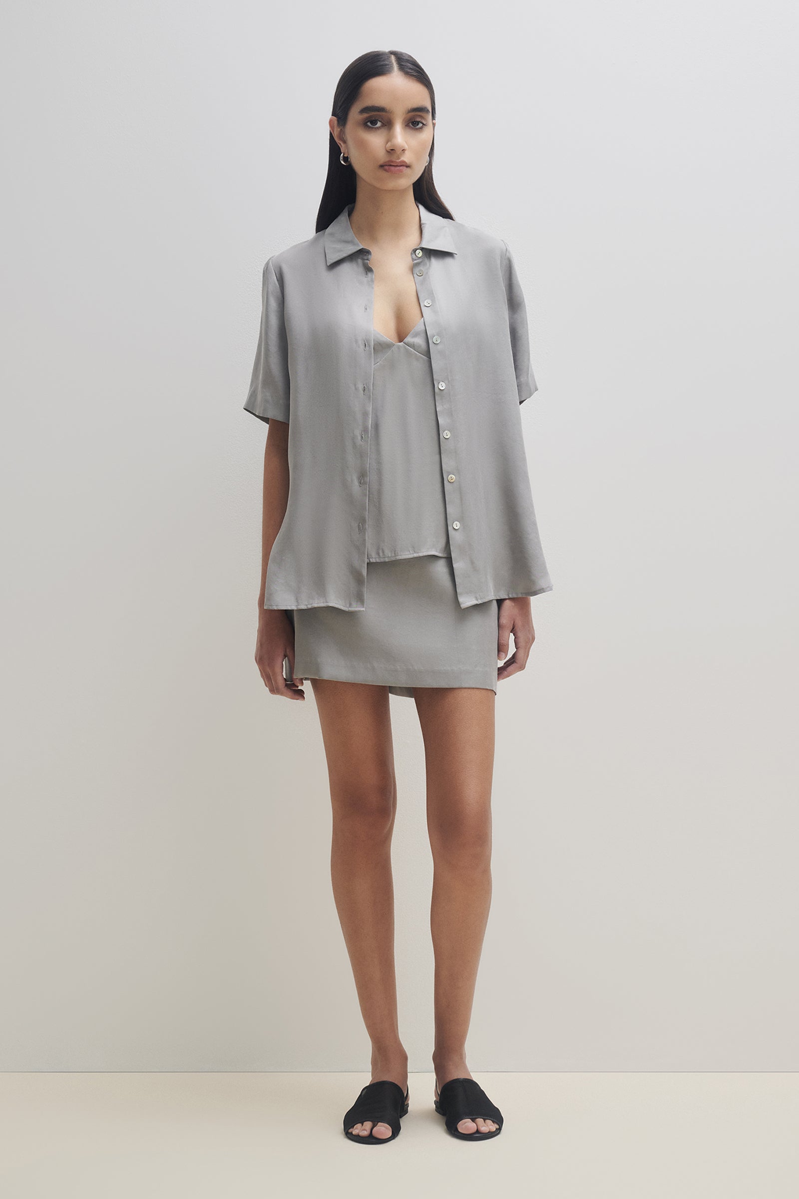 The Rylan Mini Skirt is made from a Tencel blend fabrication with a soft, sueded hand feel. The silhouette is a high rise and mini in length. Features include an invisible zipper at centre back. This skirt is fully lined.