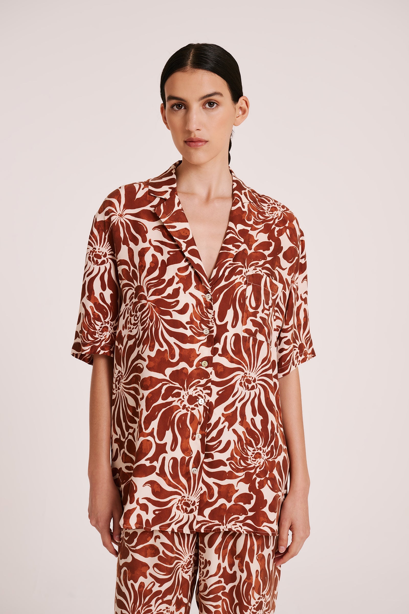 The Sabine Cupro Shirt is made in our signature cupro fabrication in our exclusive Miro print. The silhouette is relaxed, with length finishing at the hip. Features include classic shirting details with front patch pocket and shell buttons.