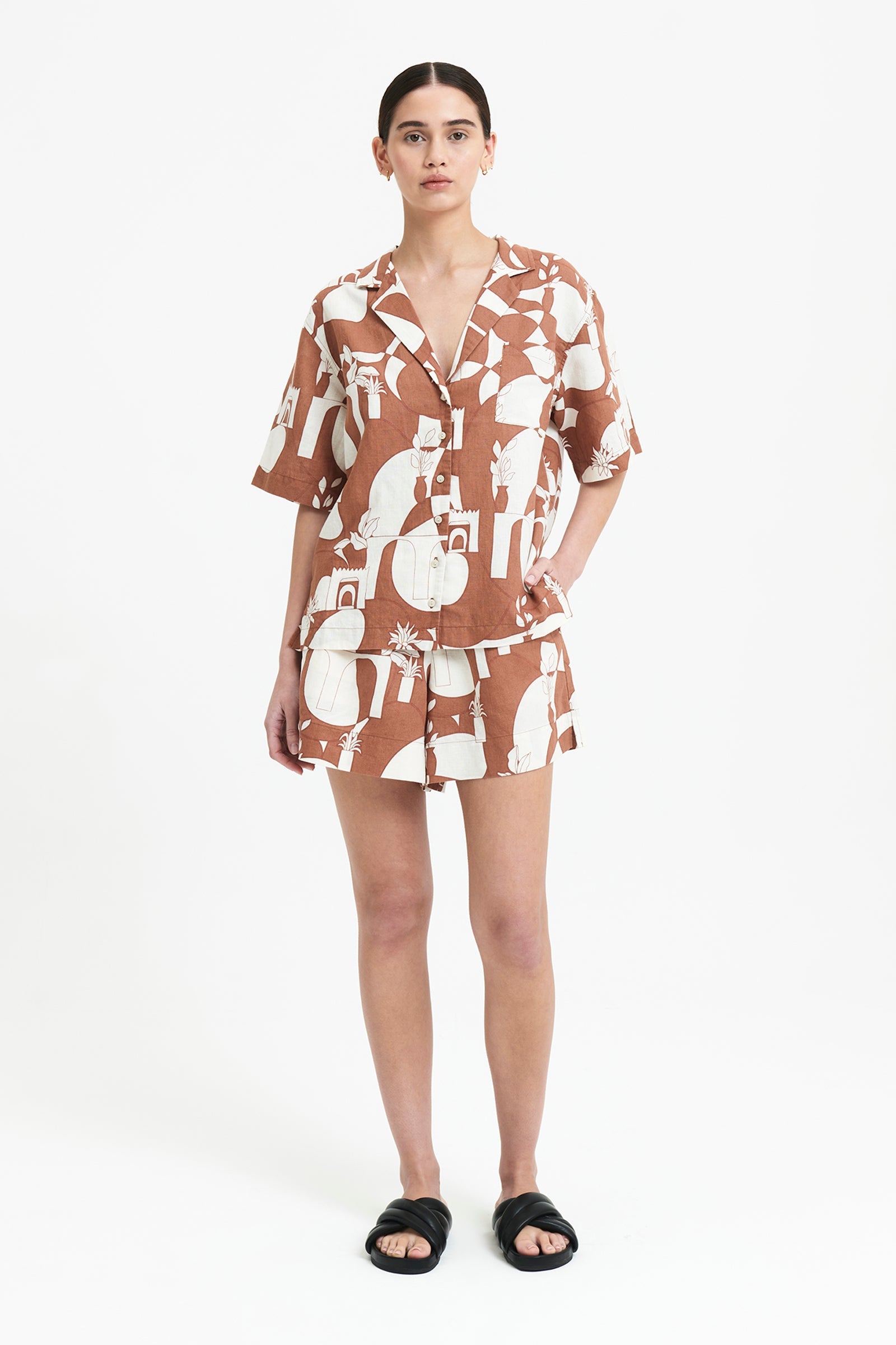 The Safia Short features our exclusive Tangier Print. Made from a breathable cotton/linen blend that has a soft handfeel. The Safia Short features an elasticated waistband, side seam pockets and back patch pockets. This short is a clean, casual fit with a wide leg opening. Pair with a Safia Shirt for  a coordinating look.