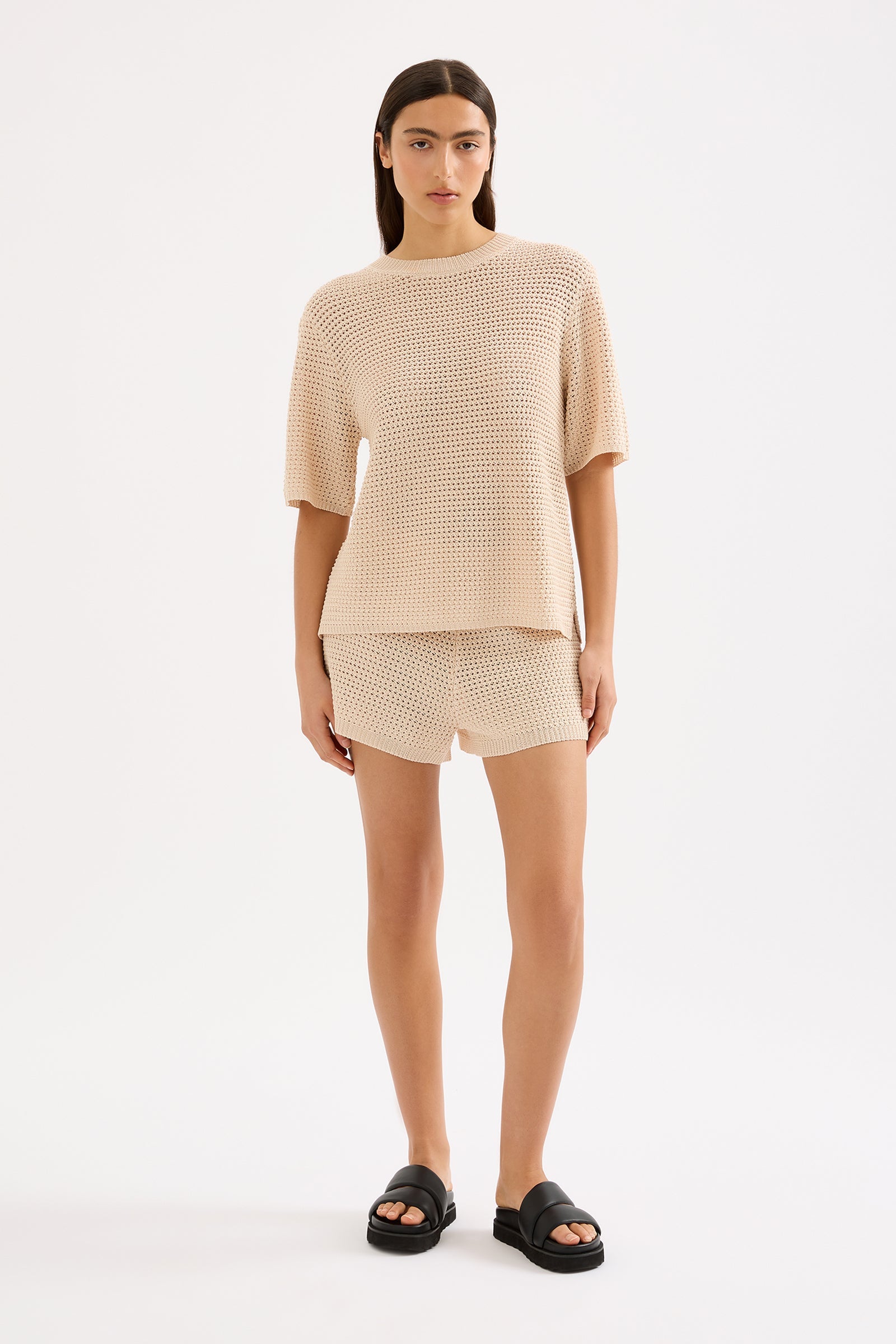 The Sawyer Crochet short is made from a midweight viscose blend yarn which has a dry hand feel and a unique crochet stitch. The silhouette is high rise with a relaxed leg and mini in length. Features include an elasticated waistband and ribbed hem.