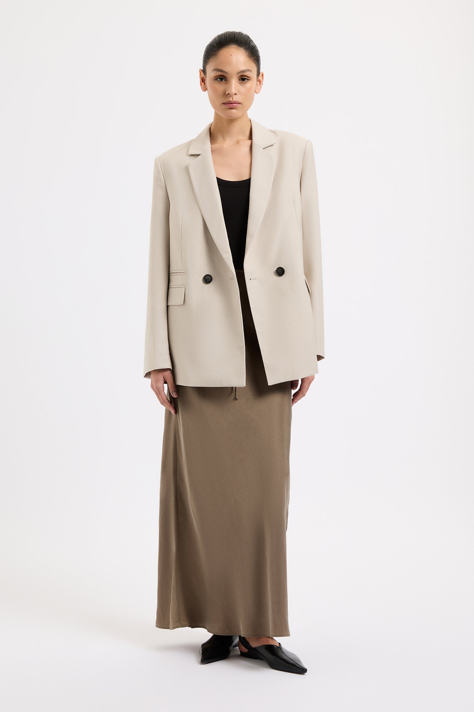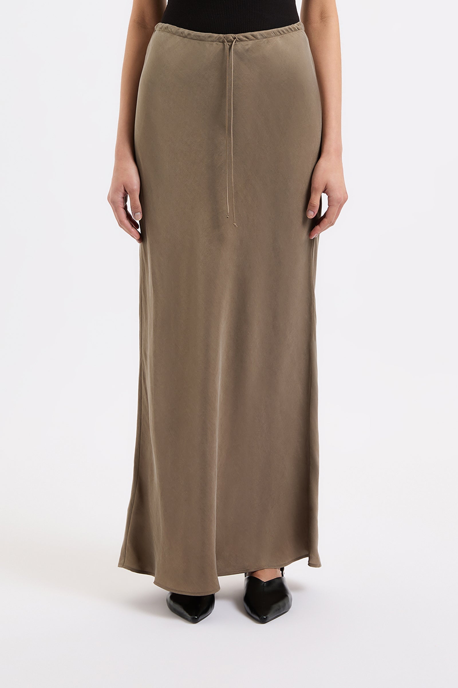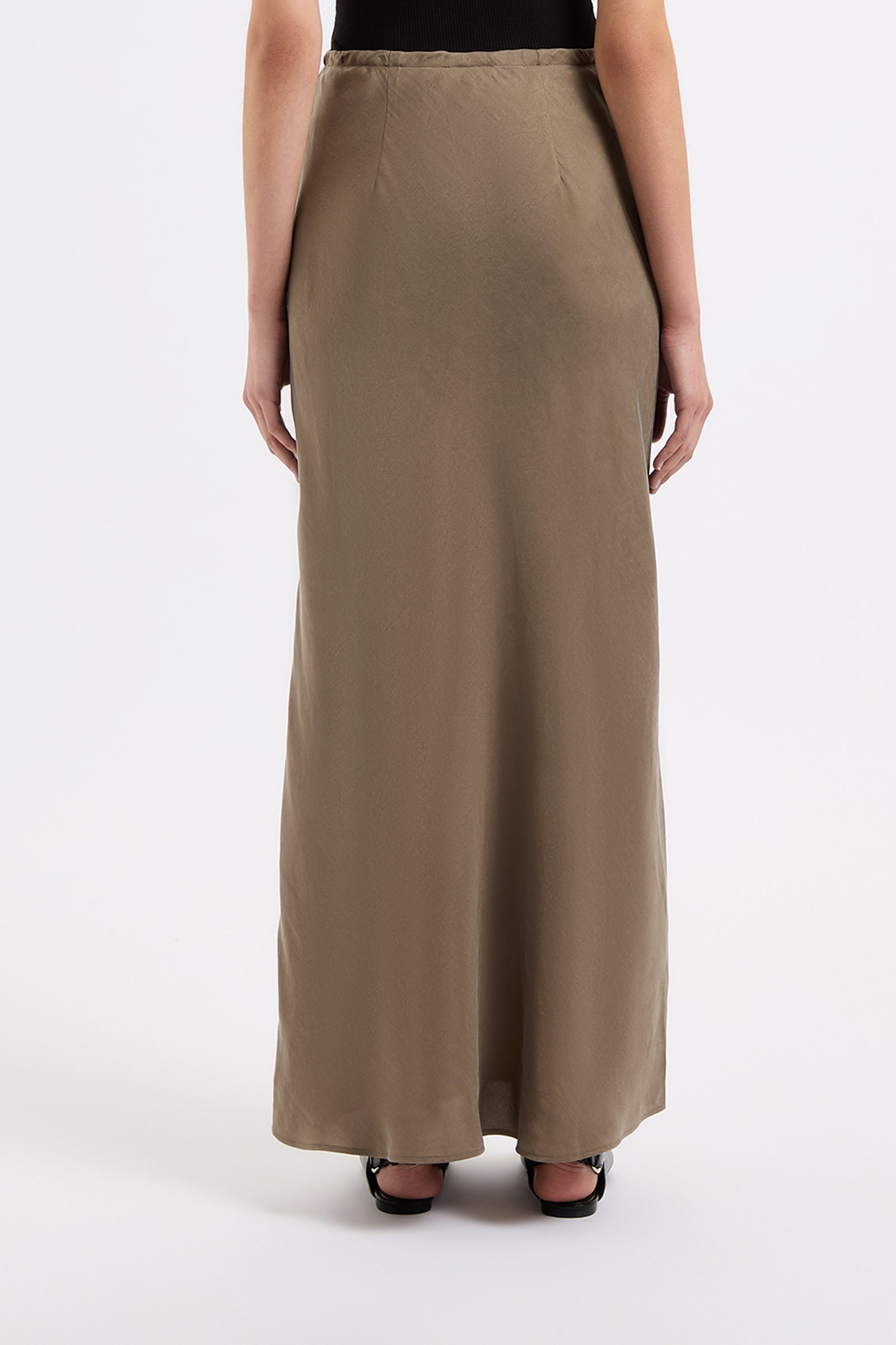 The Seshni Tencel Maxi Skirt is made from a Tencel blend fabrication with a soft, sueded hand feel. Cut on the bias, this silhouette finishes just above the ankles. Features include encased elasticated waistband with a self cut draw string at centre front.