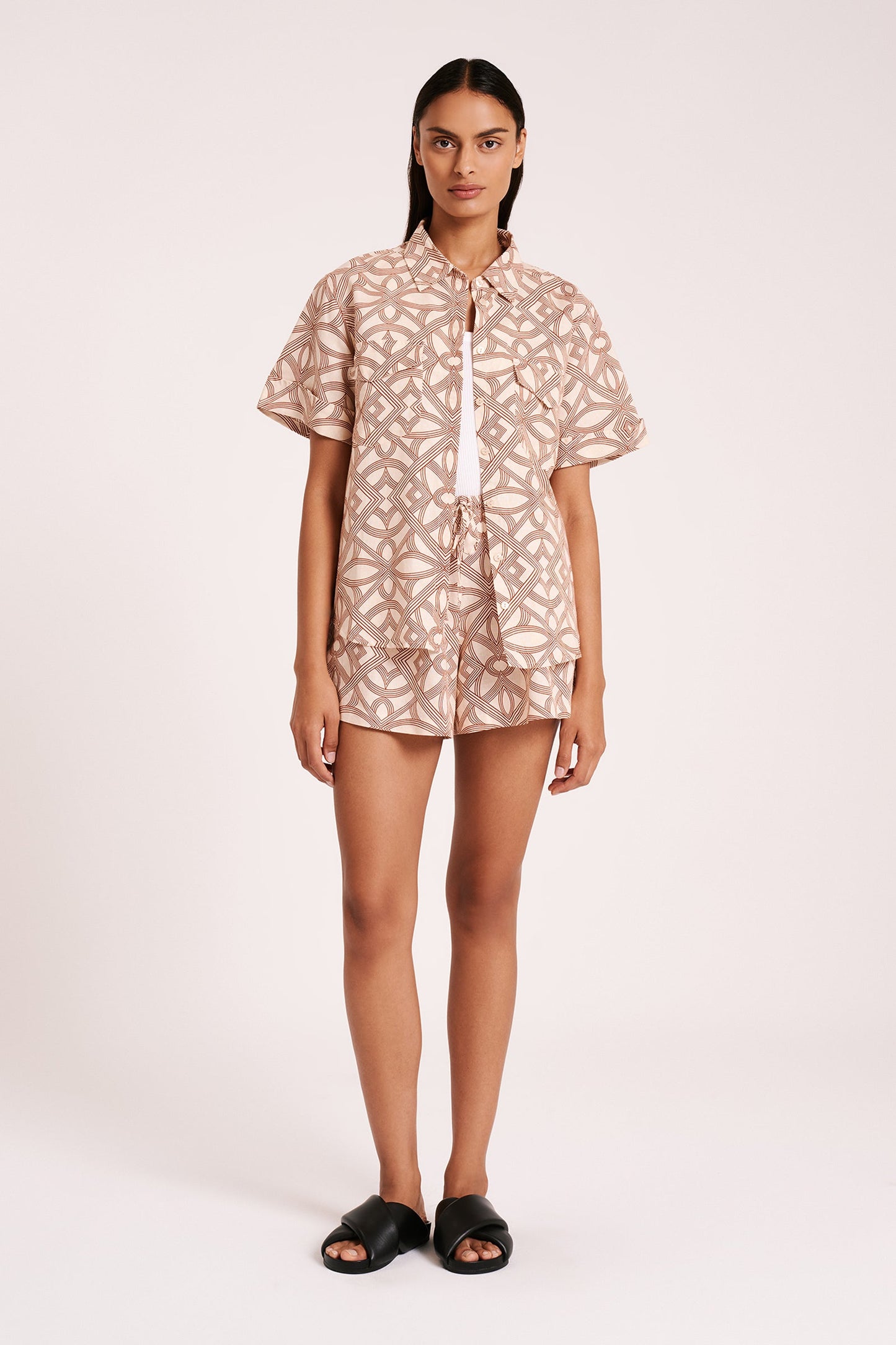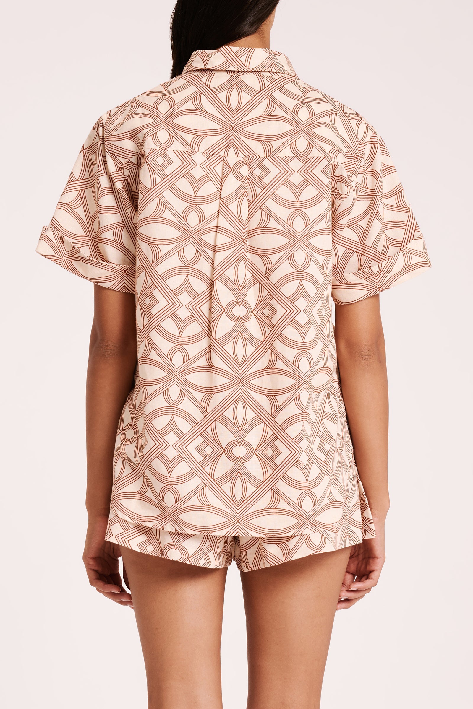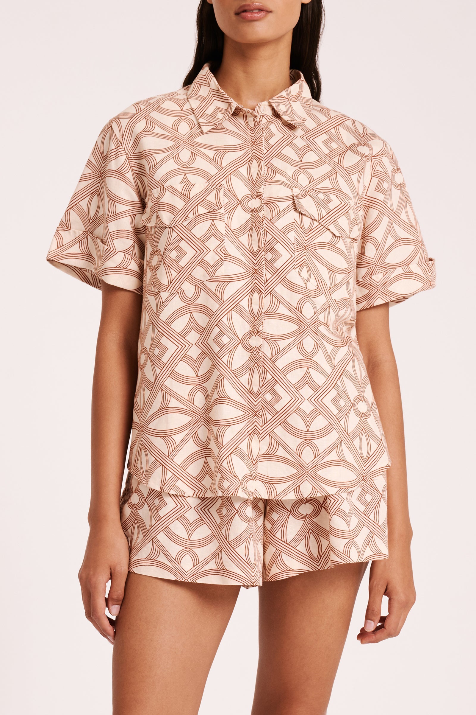 The Shani Linen Shirt is made from a linen/cotton blend in our exclusive Seville print. The silhouette is relaxed, with length finishing at the hip. Features include classic shirting details with front patch pockets, rolled sleeve cuff and shell buttons.