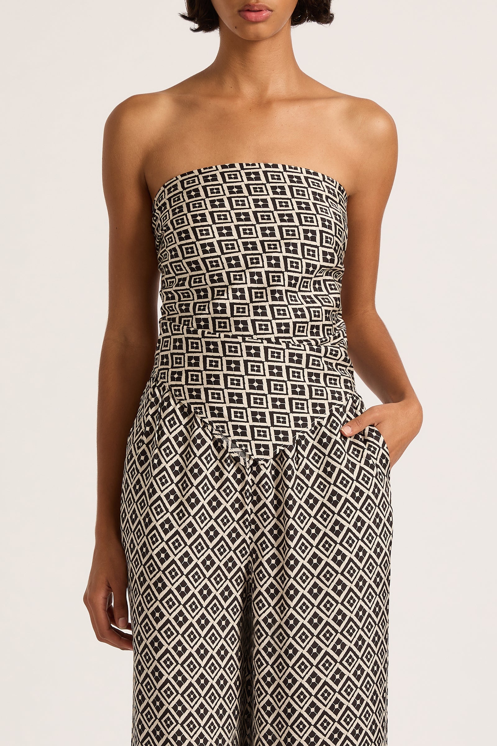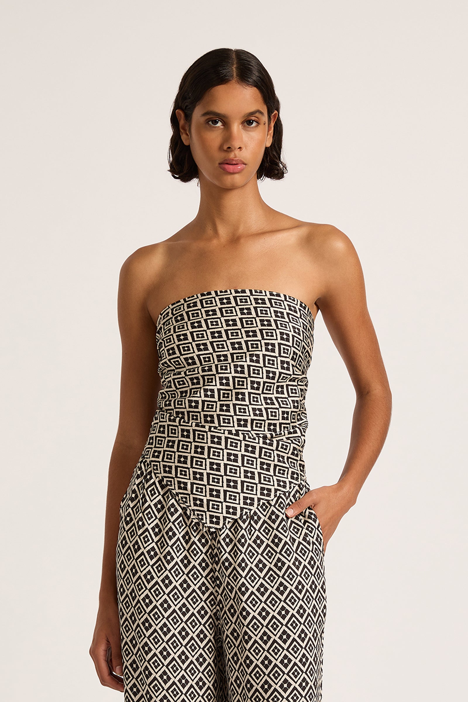The Simone Scarf is made from a lyocell blend fabrication in our exclusive Daiya print. The scarf is a smooth single layer piece with a neat double turned hem. Designed with versatility, this scarf can be worn as either a top, head scarf, or bag accessory.