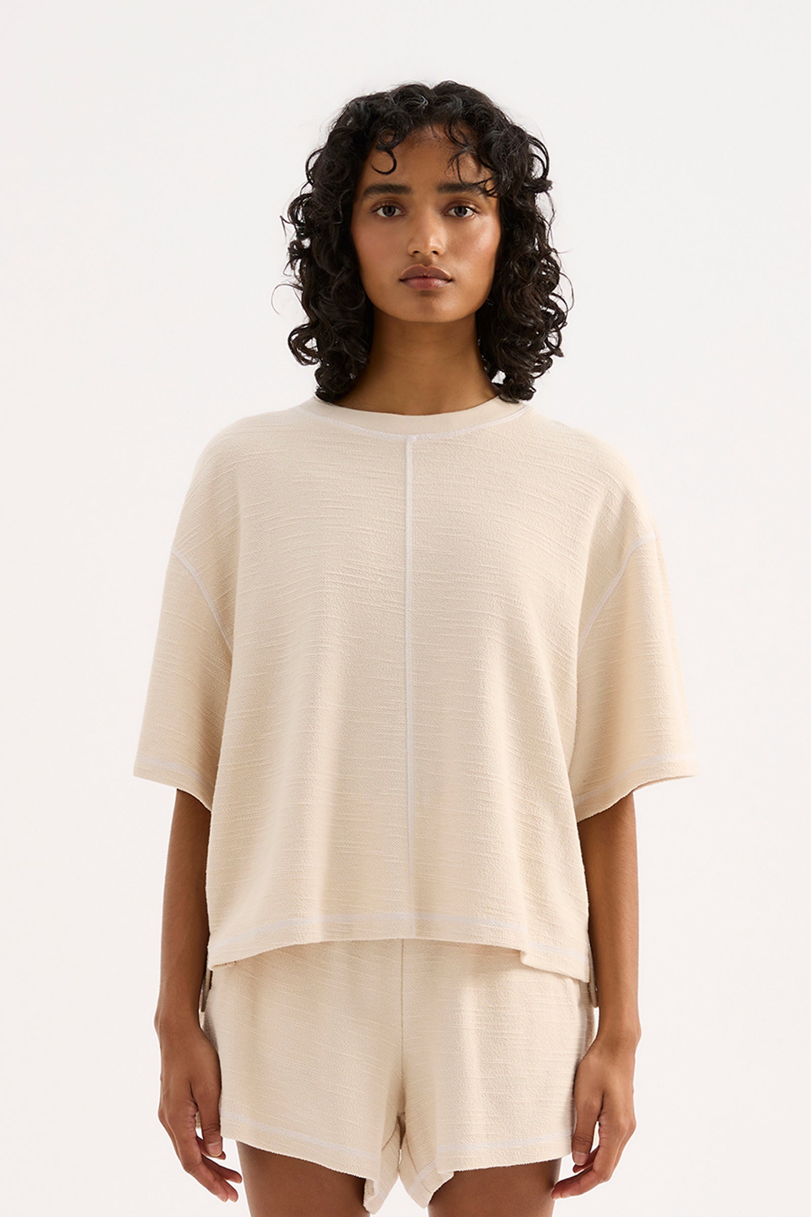 The Sutton Tee is made from a textured cotton fabrication that is soft on the skin. The silhouette is a boxy fit finishing at the hip with short wide sleeves. Features include a crew neckline, stepped hem with side slits and contrast stitching detail.
