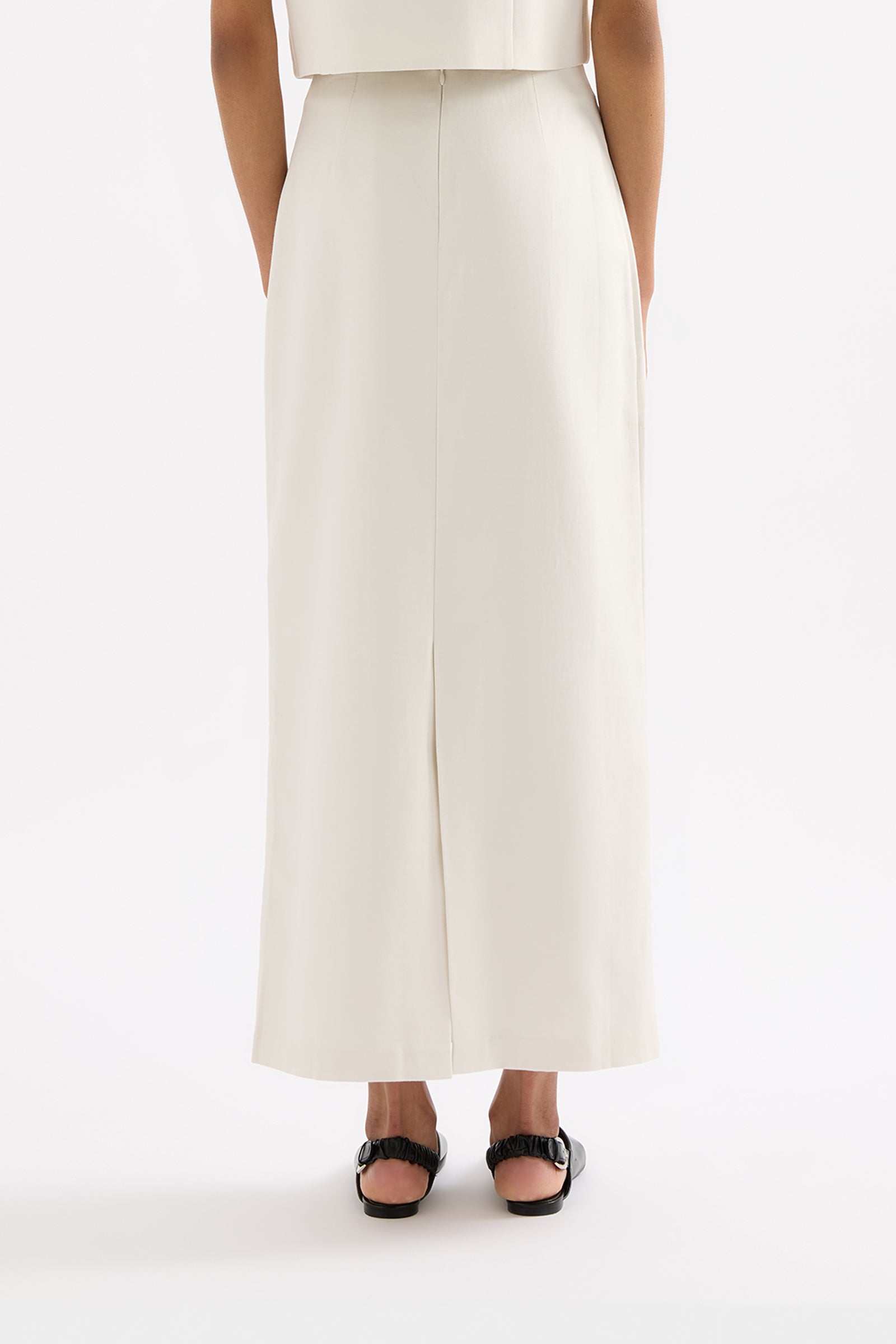 The Tait Maxi Skirt is made from a mid weight Tencel/cotton fabrication which has a textured hand feel. The silhouette is high waisted, straight fit with length finishing above the ankles. Features include external dart detail, centre back vent and zipper opening.
