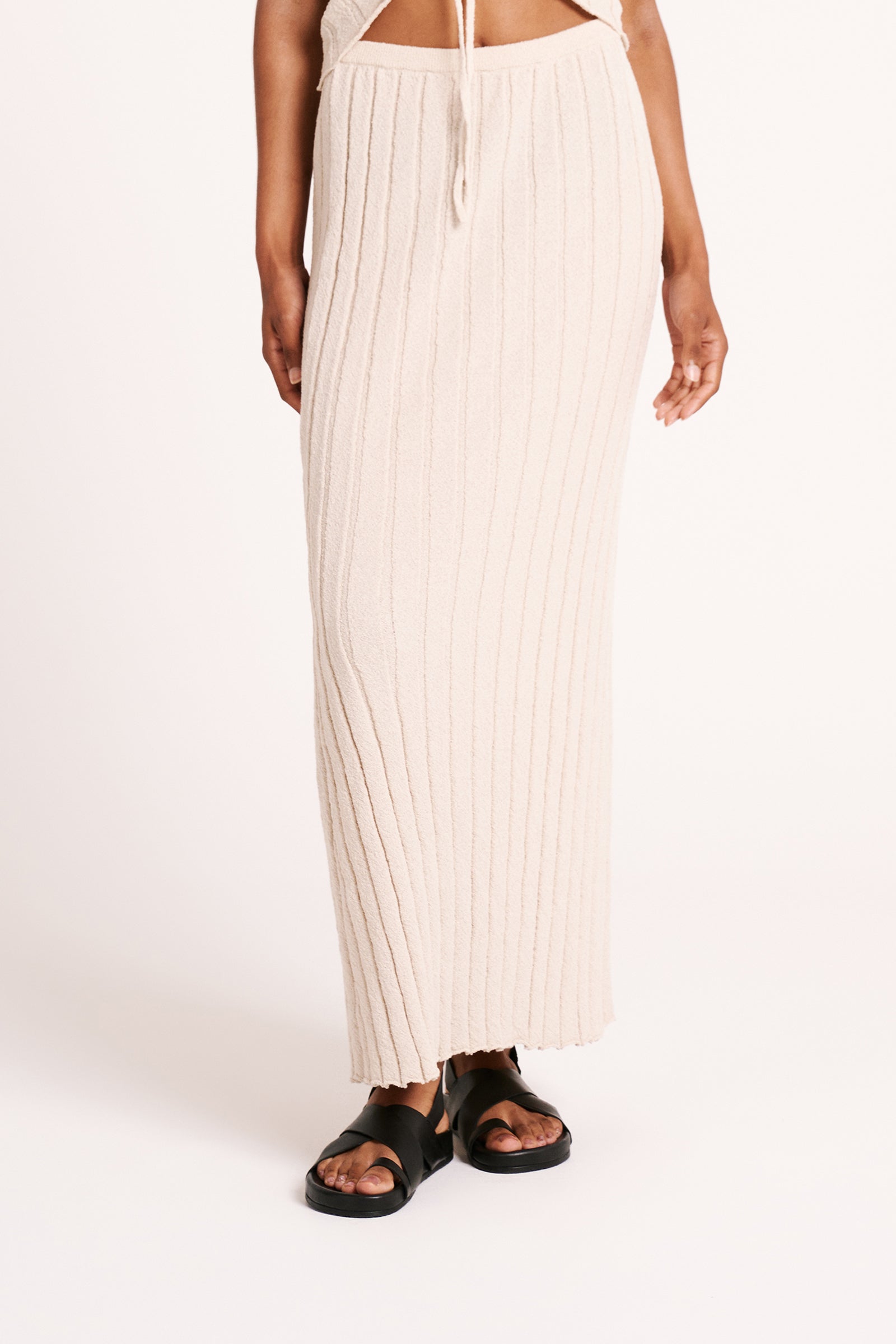 The Taiyo Knit Skirt in stone is made from a lightweight, textured knit with a dry hand feel. The silhouetted is fitted and finishes at ankle length. Features include an encased elasticated waistband, and a wide rib finish.