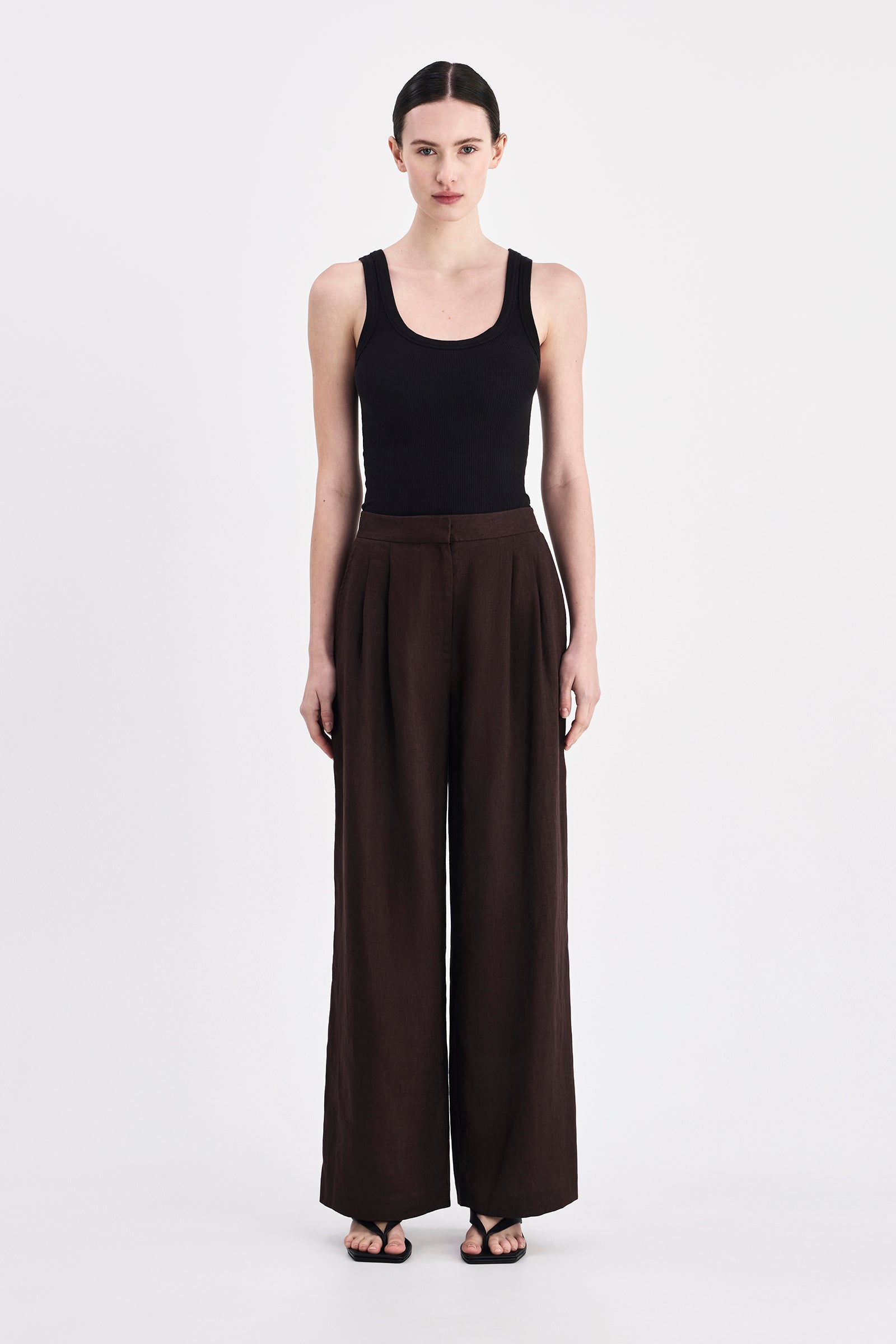 The Thilda Linen Pant in white is made from 100% linen which has been washed for a soft, breathable hand feel. The silhouette is a classic mid-rise with wide tailored leg finishing full length. Features include front pleats at waist & concealed button and trouser hook closure.
