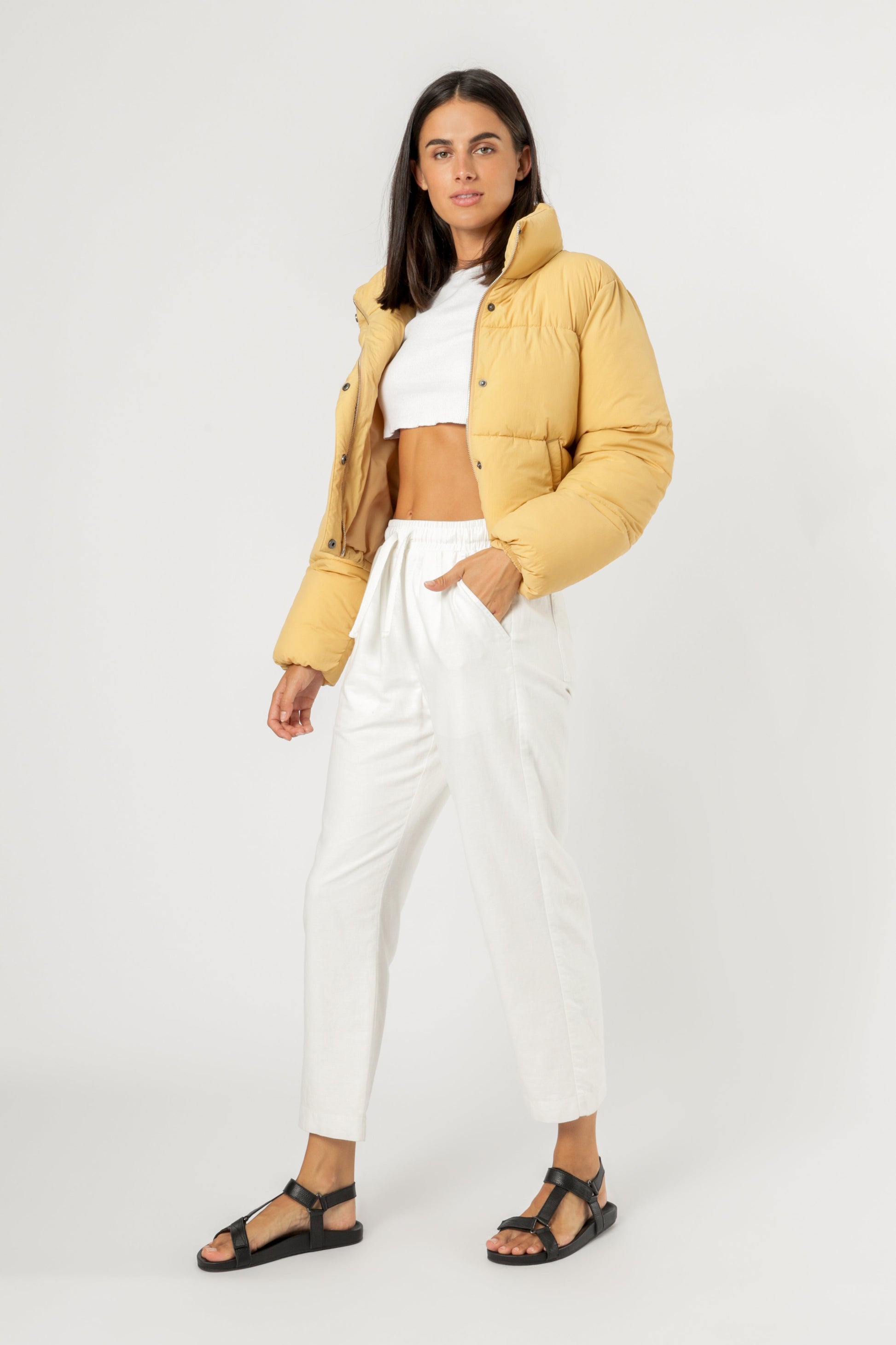 Look amazing as the climate cools with the Topher Puffer Jacket by Nude Lucy. Featuring a stand collar, welted waist pockets, quilted puffer construction, and an internal drawcord through the hemline. Pair with a basic cotton tshirt and a linen pant for an on trend winter ensemble.