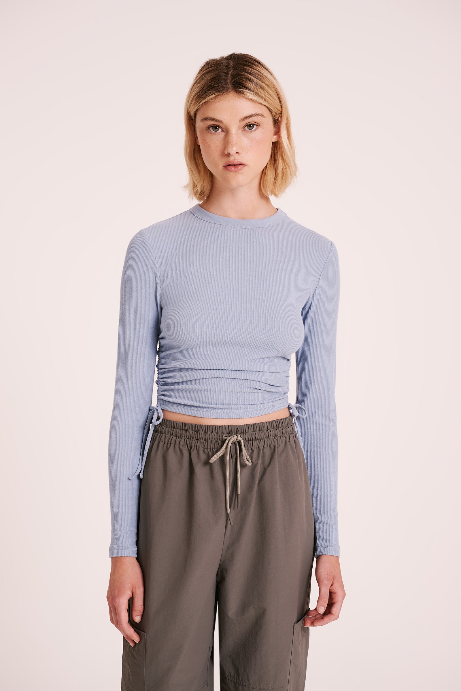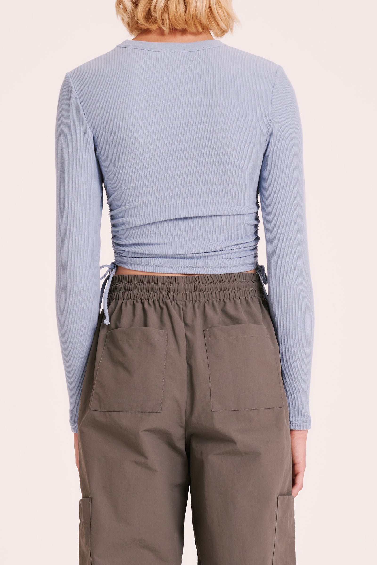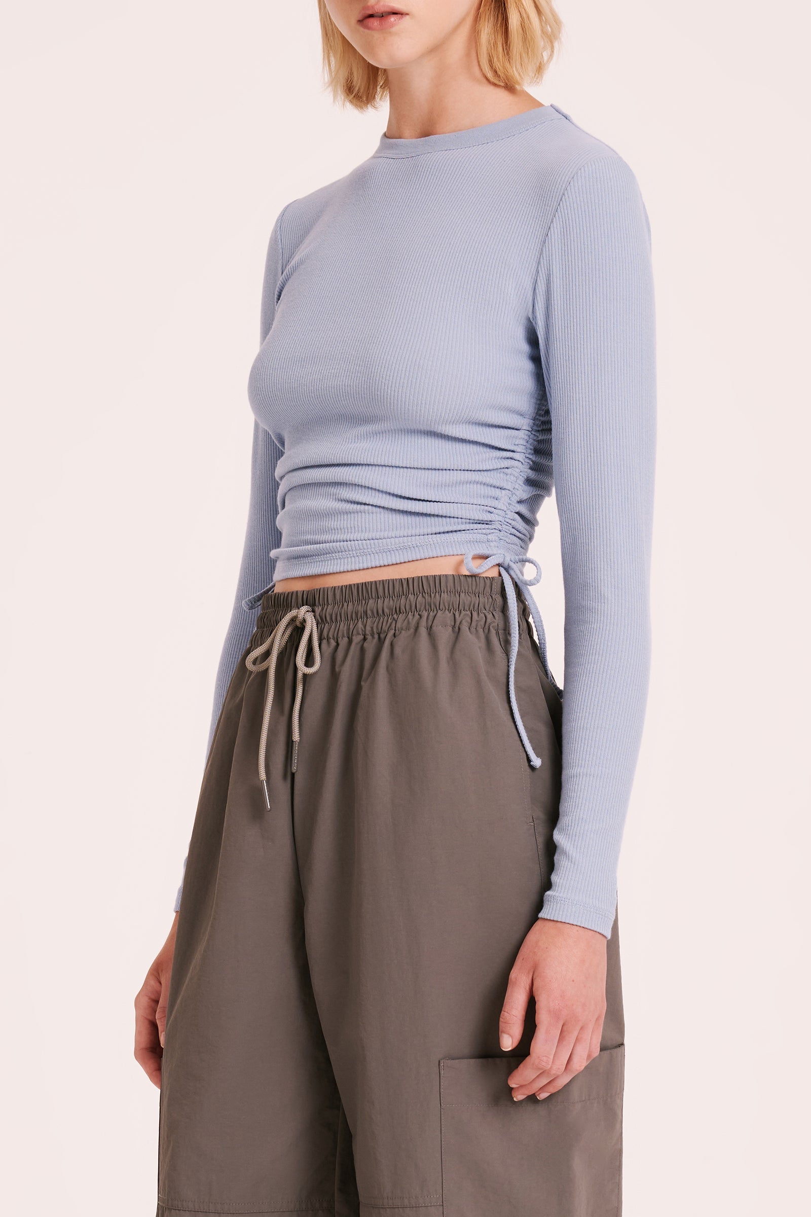 The Tie LS Tee in Sky is made from a high quality organic cotton which has a soft hand feel. The silhouette is a flattering close fit. Features include a crew neck, long fitted sleeves, and adjustable ties at side seams.
