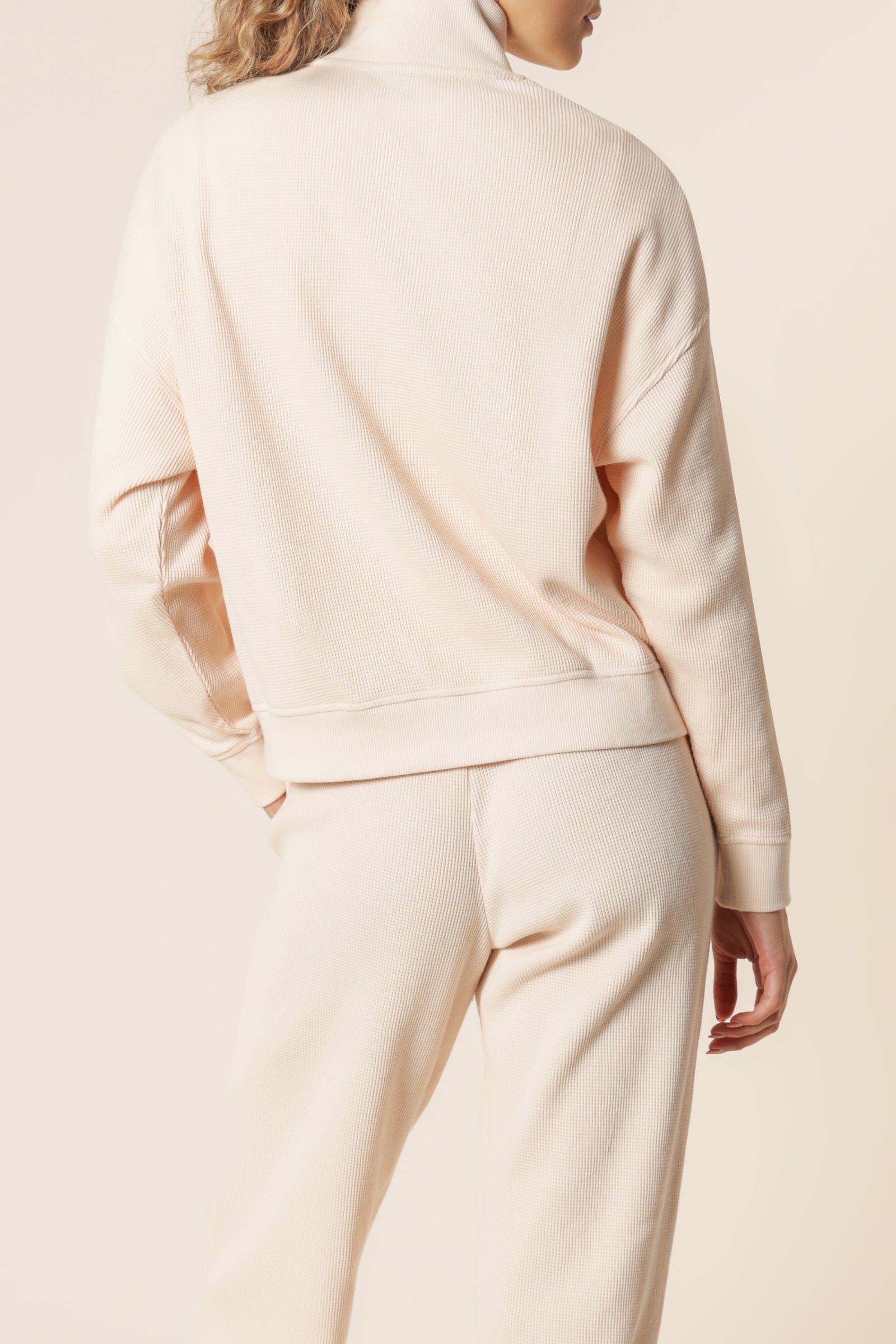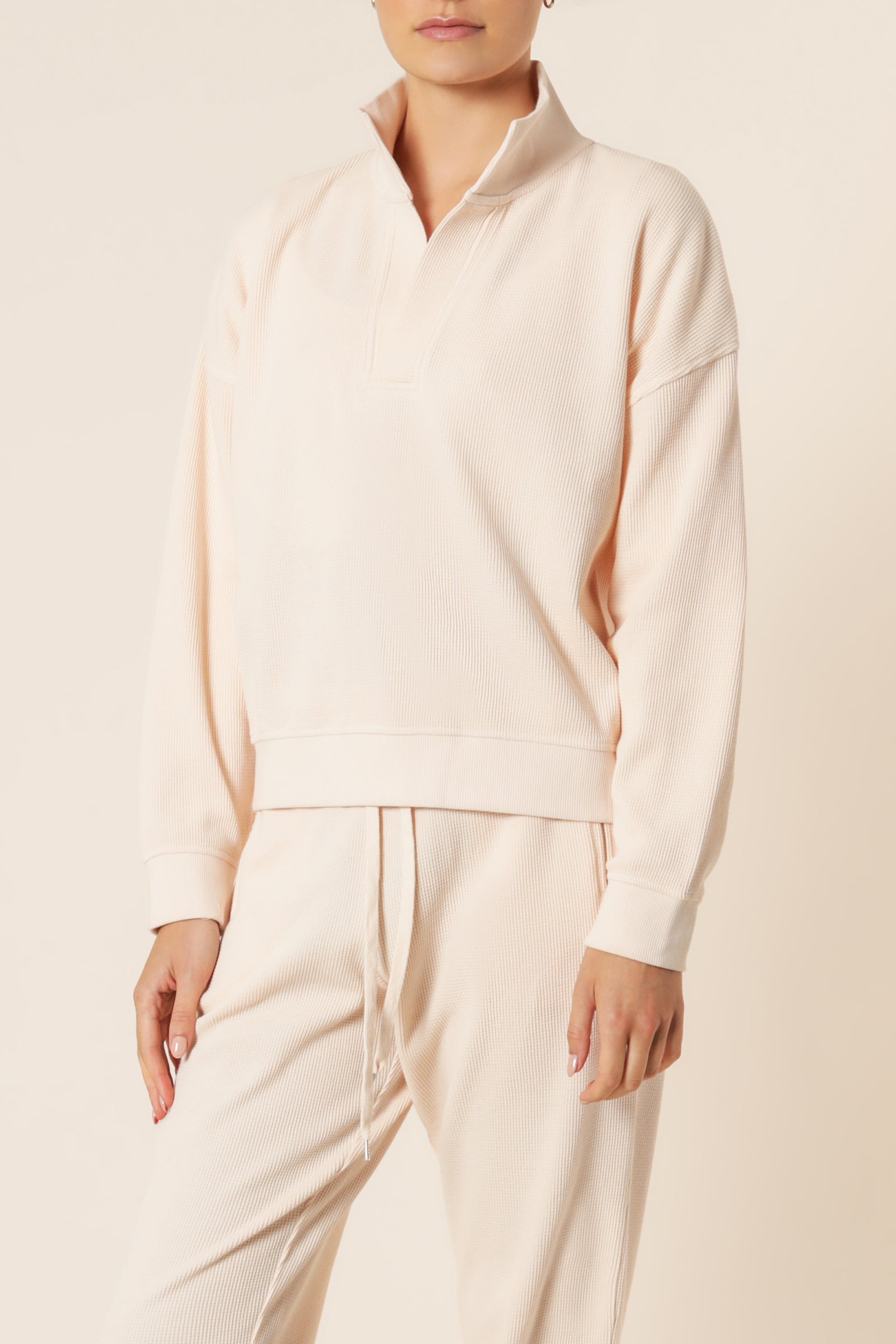 The Uma Waffle Top by Nude Lucy is a key piece to add to your basics wardrobe edit. Crafted from a subtle Biscuit colour waffle-knit cotton jersey , this rugby-style top ensures an on-trend yet comfortable silhouette. It features a ribbed collar with long sleeves, with a looser fitting body for the ultimate lounge look. Try this style out with the co-ordinating Uma Waffle Trackpant or short.