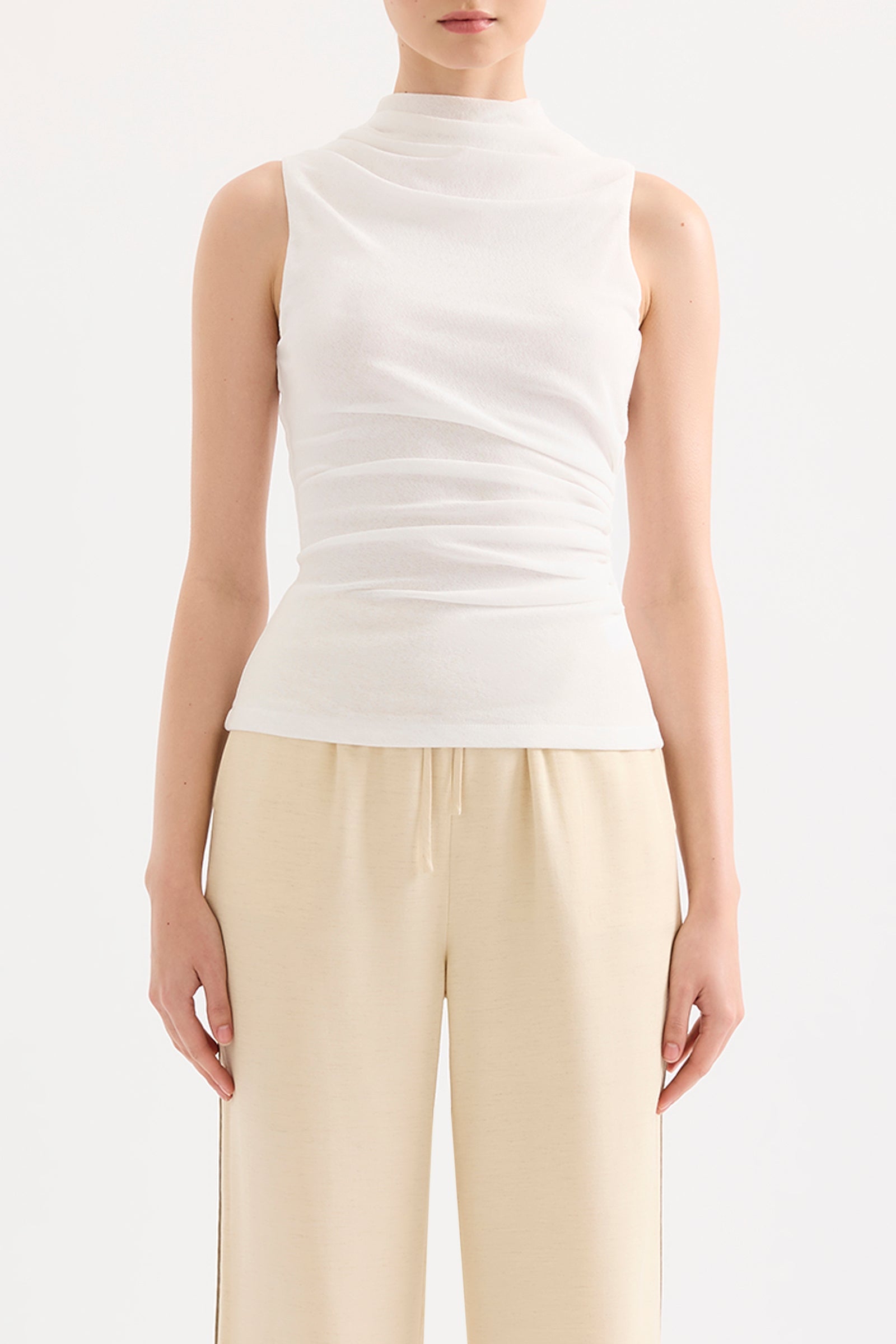 The Winston Mesh Top is made from a stretch jersey with a dry hand feel. The silhouette is a form fitting tank with length finishing at the hip. Features include a raised neckline with soft gathering detail, and asymmetric draped gathering across the body. This top is fully lined.