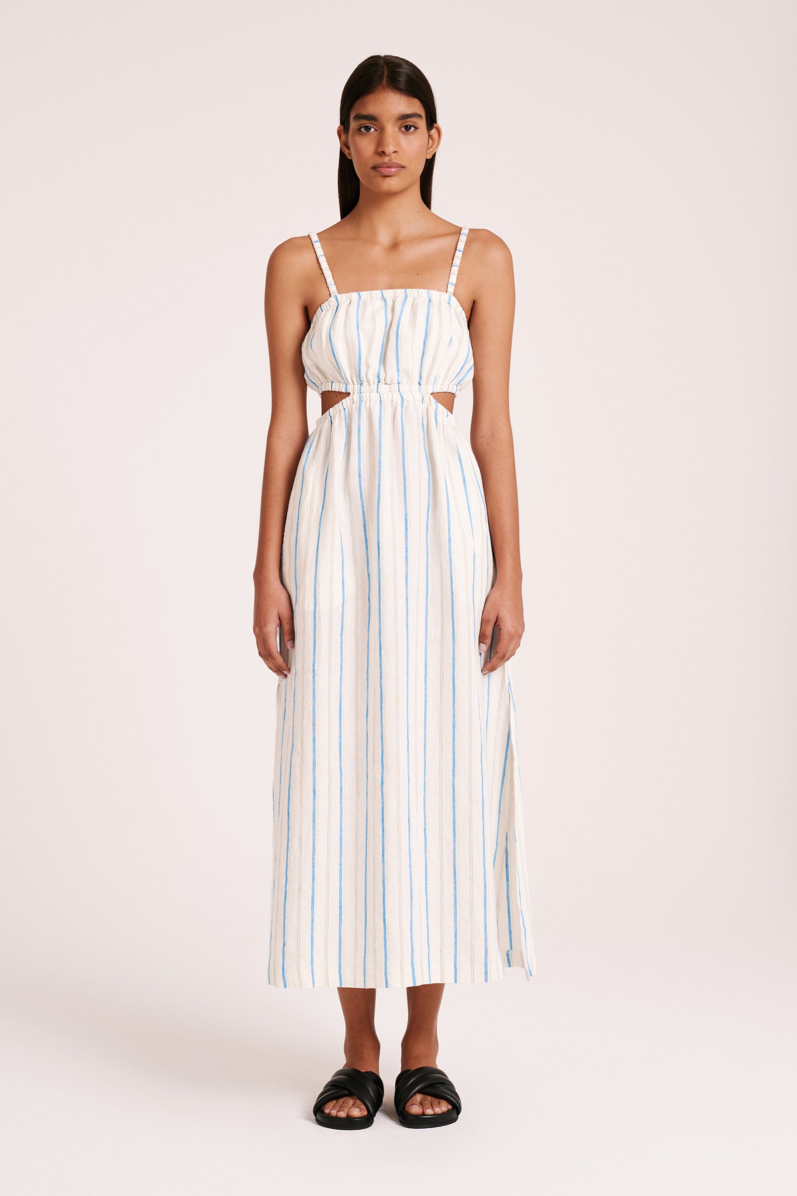 The Yin Linen Dress is made from a premium linen fabrication in our exclusive Azure Stripe. The silhouette is fitted at the waist with a full skirt finishing above the ankle. Features include elasticated cut outs on both sides of the body, inseam pockets, a square elasticated neckline and elasticated straps.