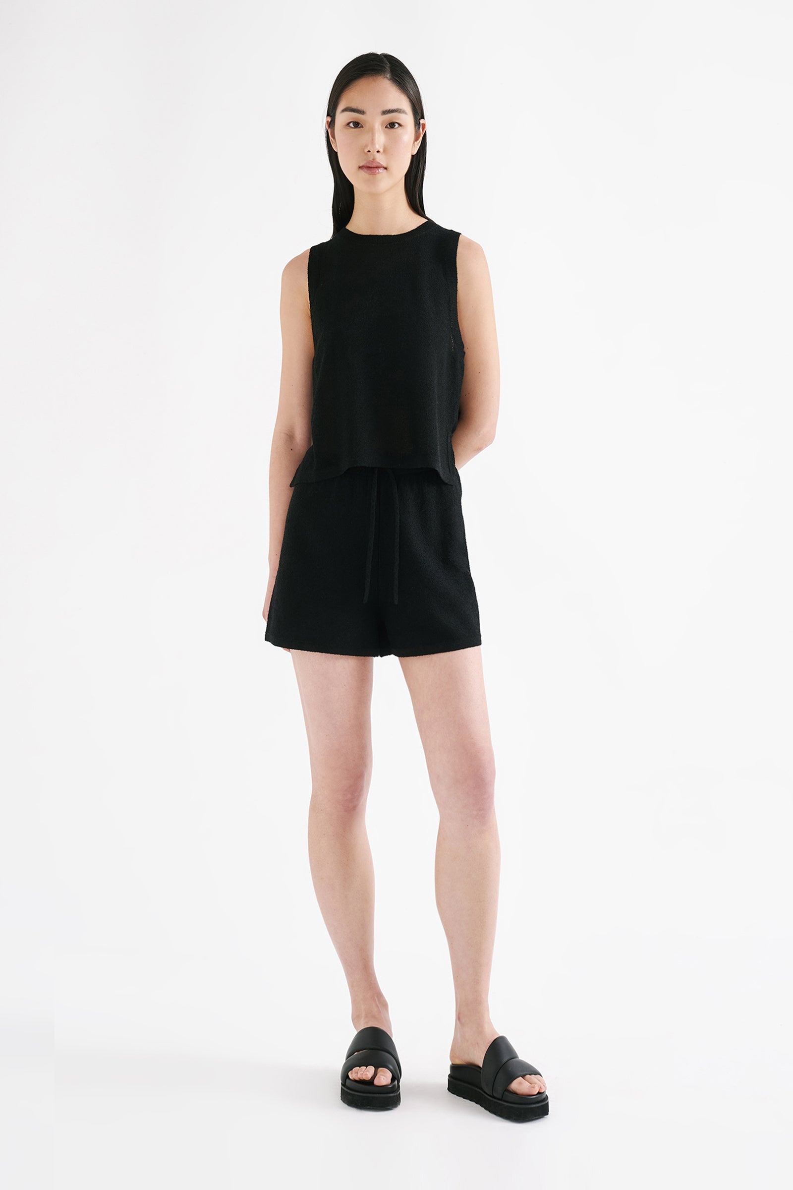 The Zosia Knit Short in black is made in a lightweight, textured knit with a dry hand feel. The silhouette is worn high on the waist and is mini in length with a wide leg opening. Features include an encased elasticated waistband with drawstring at the front.