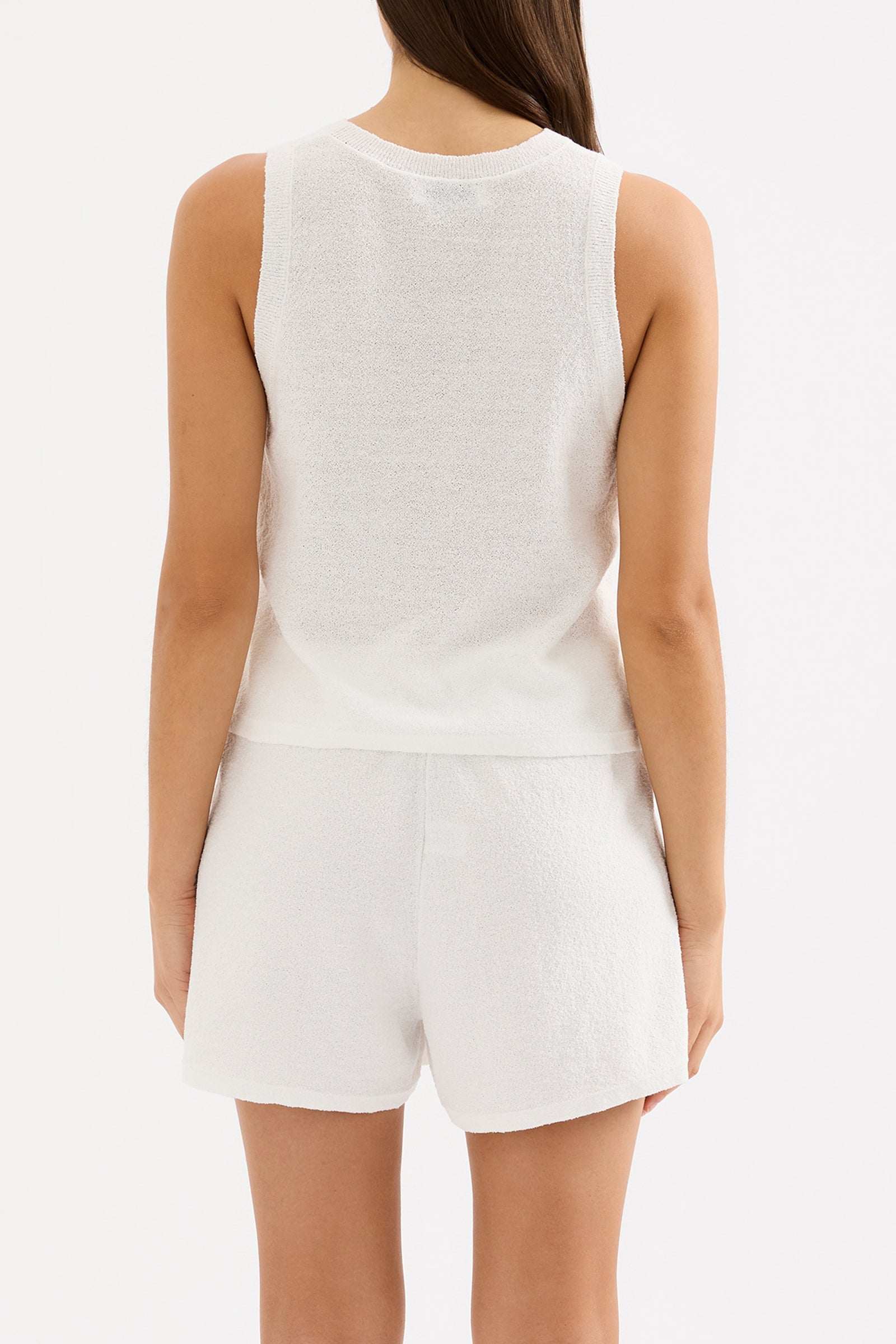 The Zosia Knit Tank is made in a lightweight, textured knit with a dry hand feel. The silhouette is relaxed, with length finishing at the hips. Features include a narrow crew neckline and a stepped hem with side seam slits.